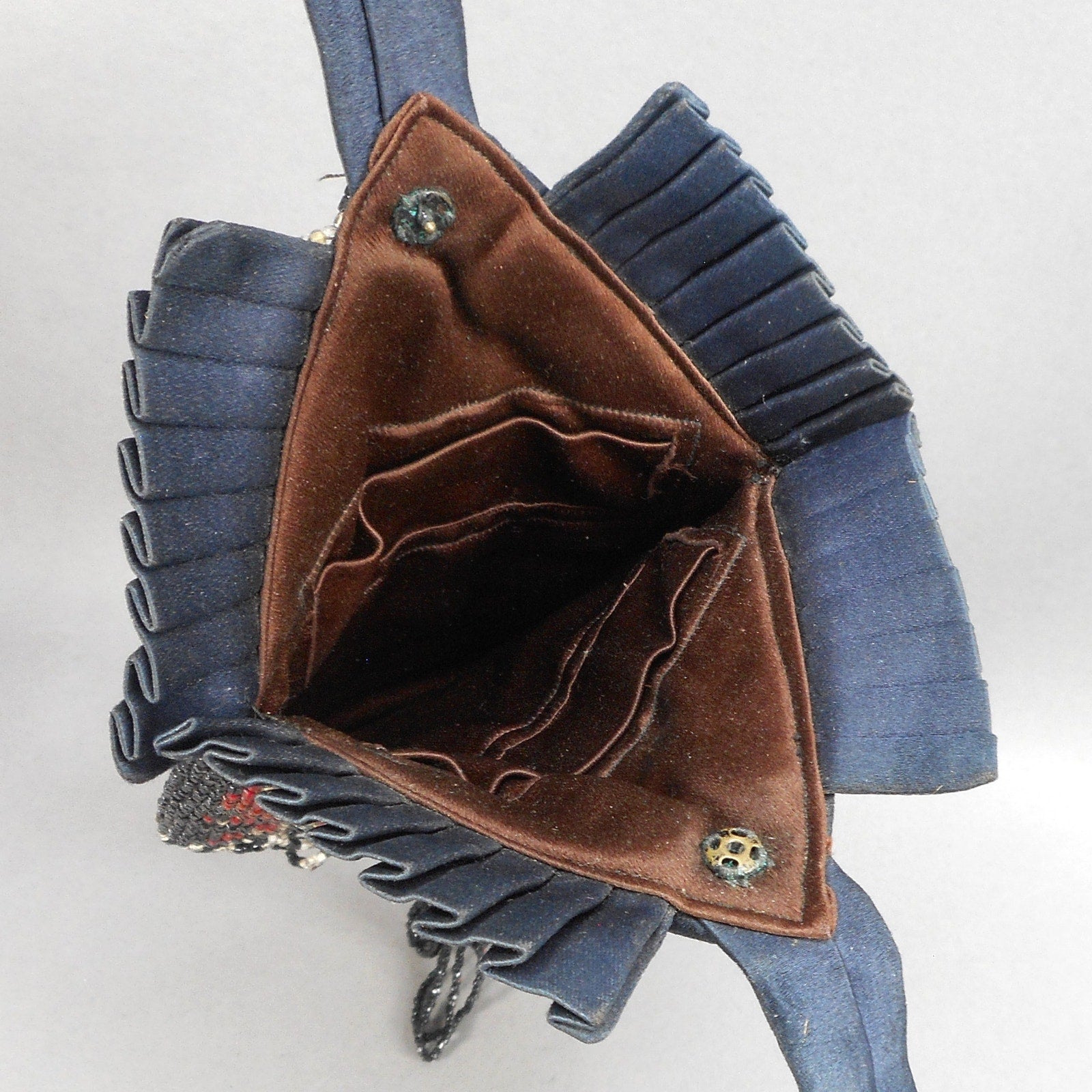 Antique condition with a little loose beading on one side - the other side is perfect - and a torn handle. Smudging to the fabric. The lining is excellent. Remarkably, the tassel is still intact.