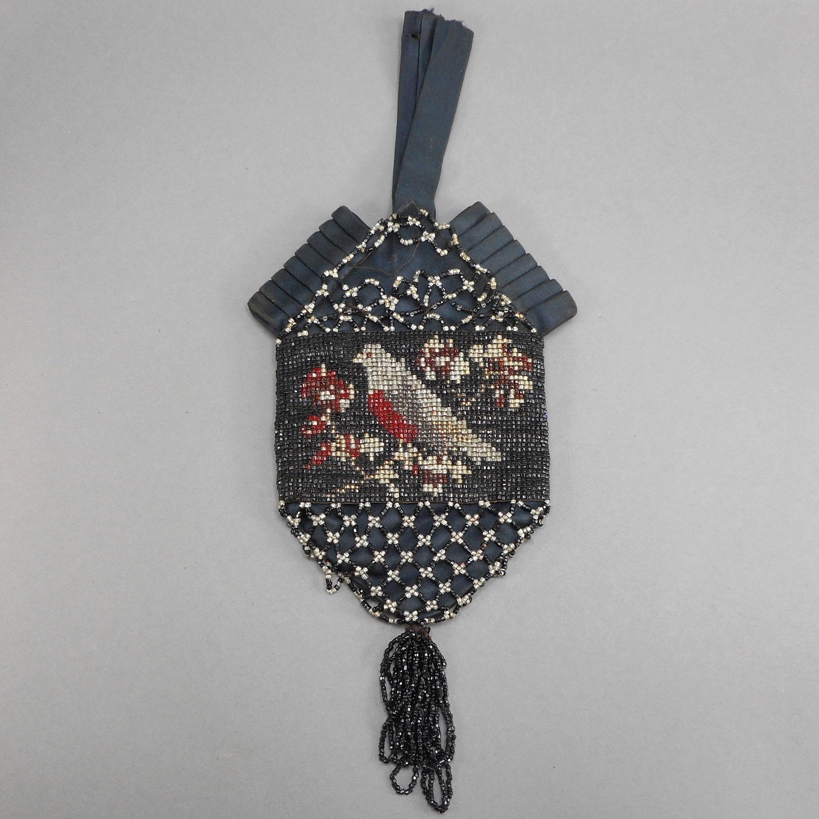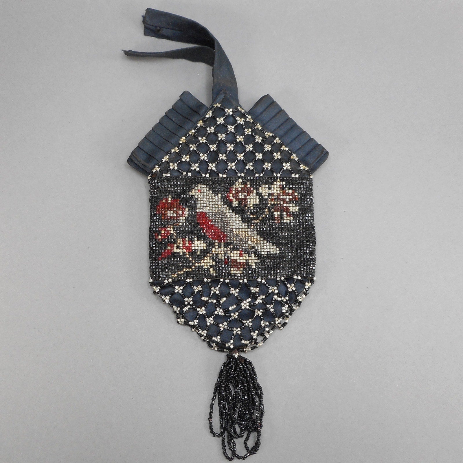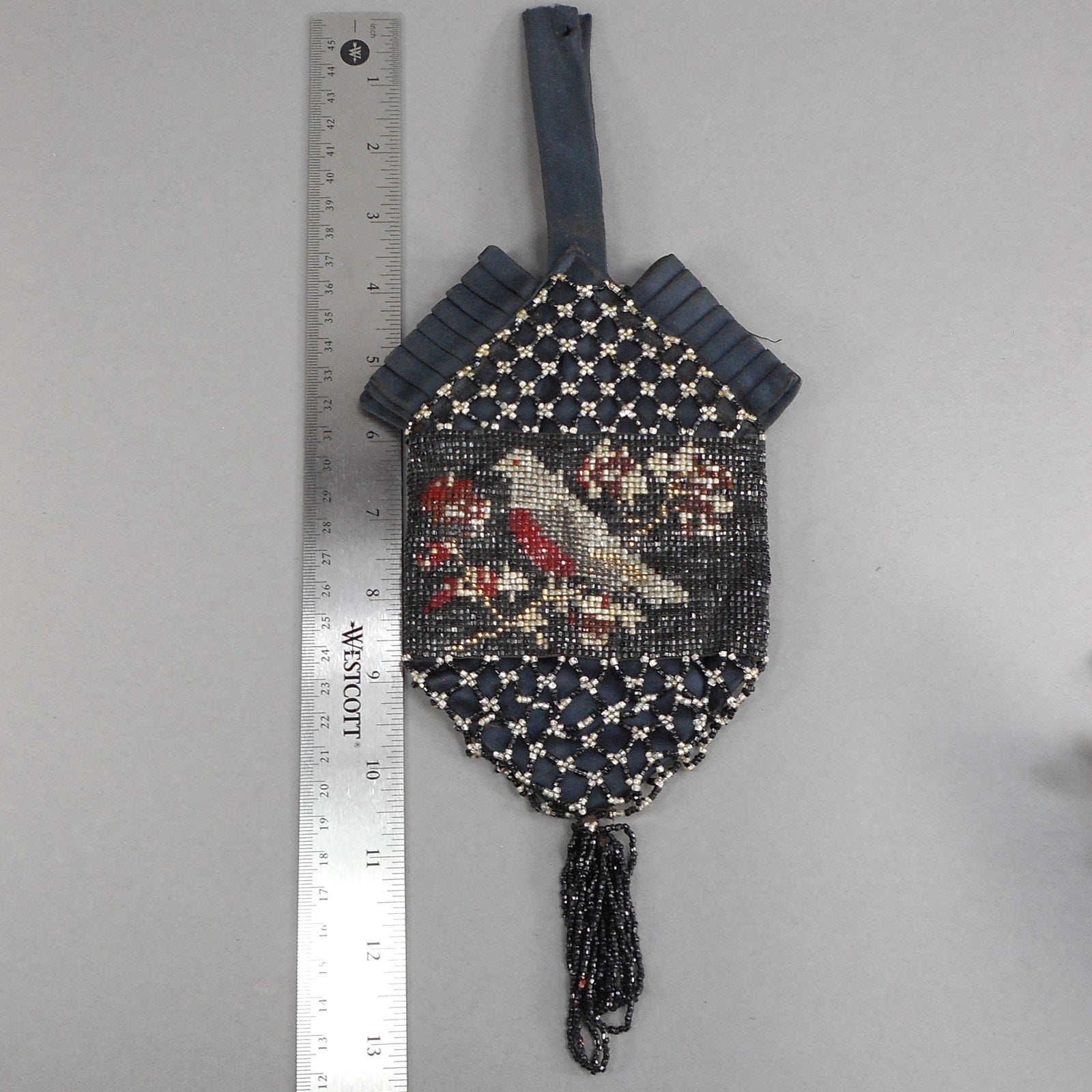 Antique Victorian Micro Bead Wristlet Purse with Beaded Tassel - Pleated Black Satin - Dove Bird Design - Black, Silver, Red