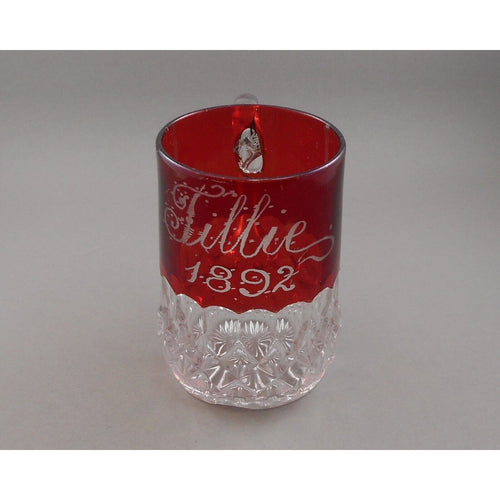 "Tillie 1892" - Antique Souvenir Ruby Stain Glass Mug - Victorian Etched Red Flash Pressed Glass Cup