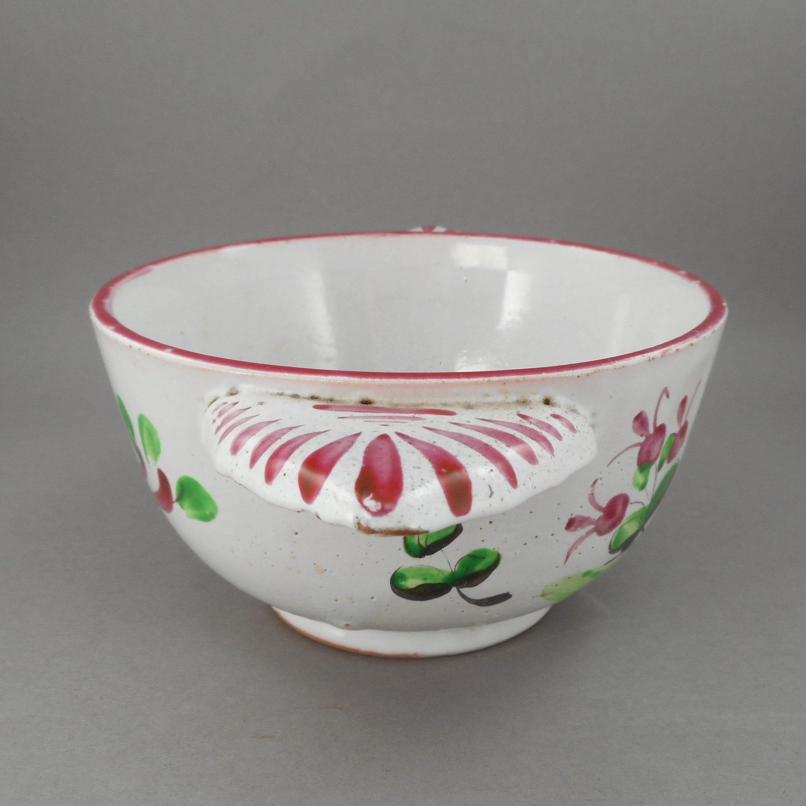 Antique French Faience Pottery Porringer Bowl with Lug Handles - Handpainted Rooster Chanticleer and Flowers - marked France - White Red Pink