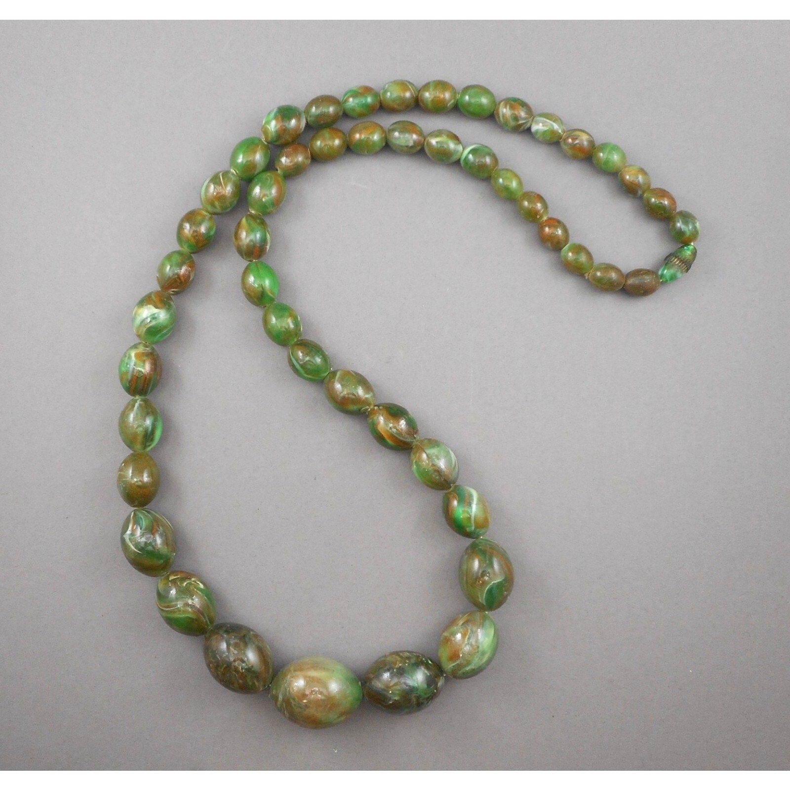 A vintage opera length necklace of graduated marbled plastic beads. Swirl design of green, white and brown plastic, threaded plastic barrel clasp.