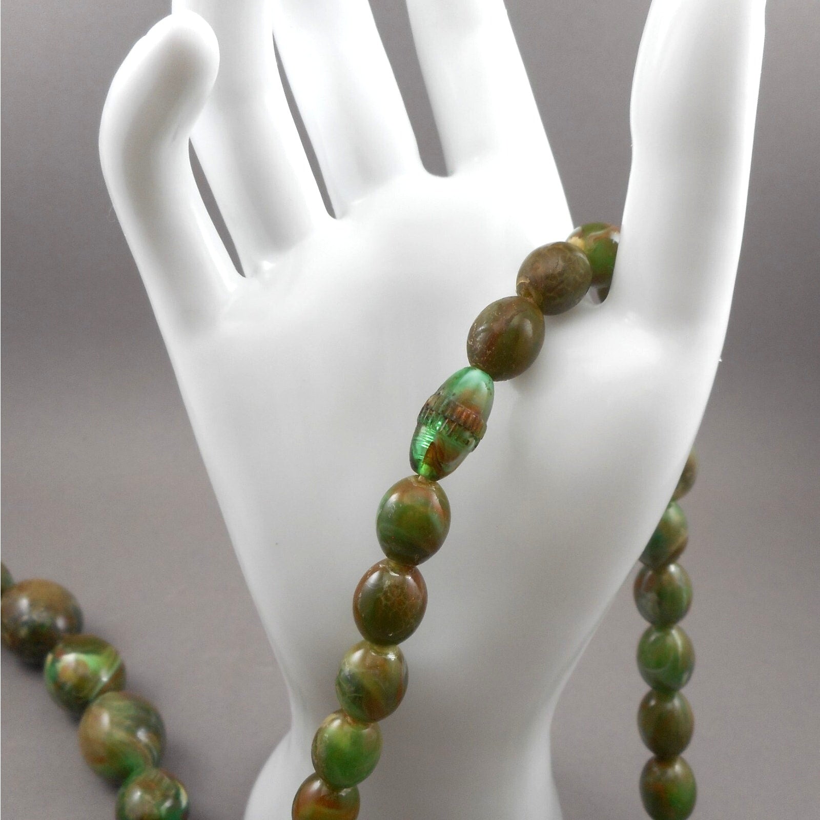 Long Vintage Green Marble Graduated Bead Necklace Old Swirl Plastic Opera Length