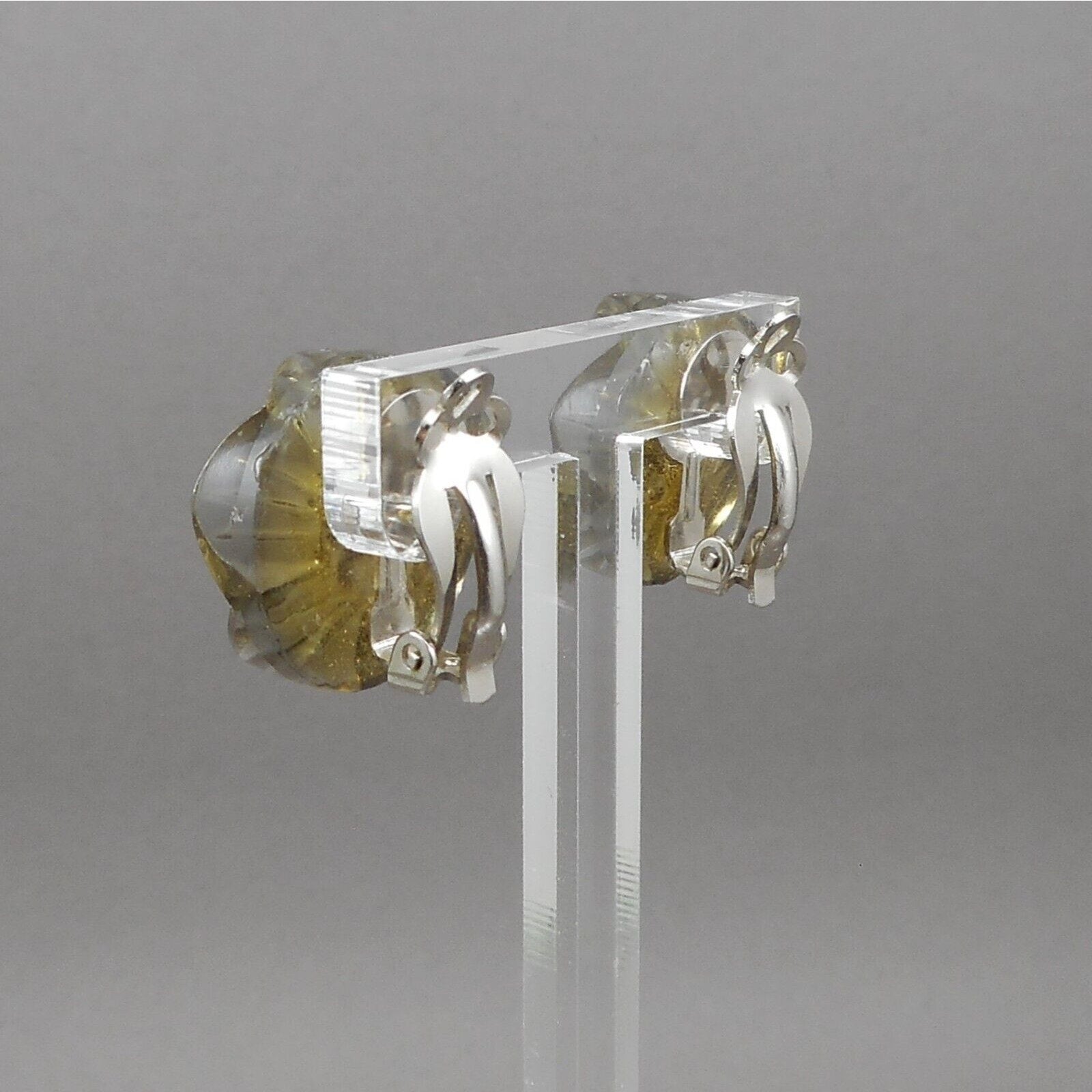 Vintage button style earrings, circa 1950. Pale gold glass flowers highlighted with black and silver. Silver tone backings and clips for non pierced ears.