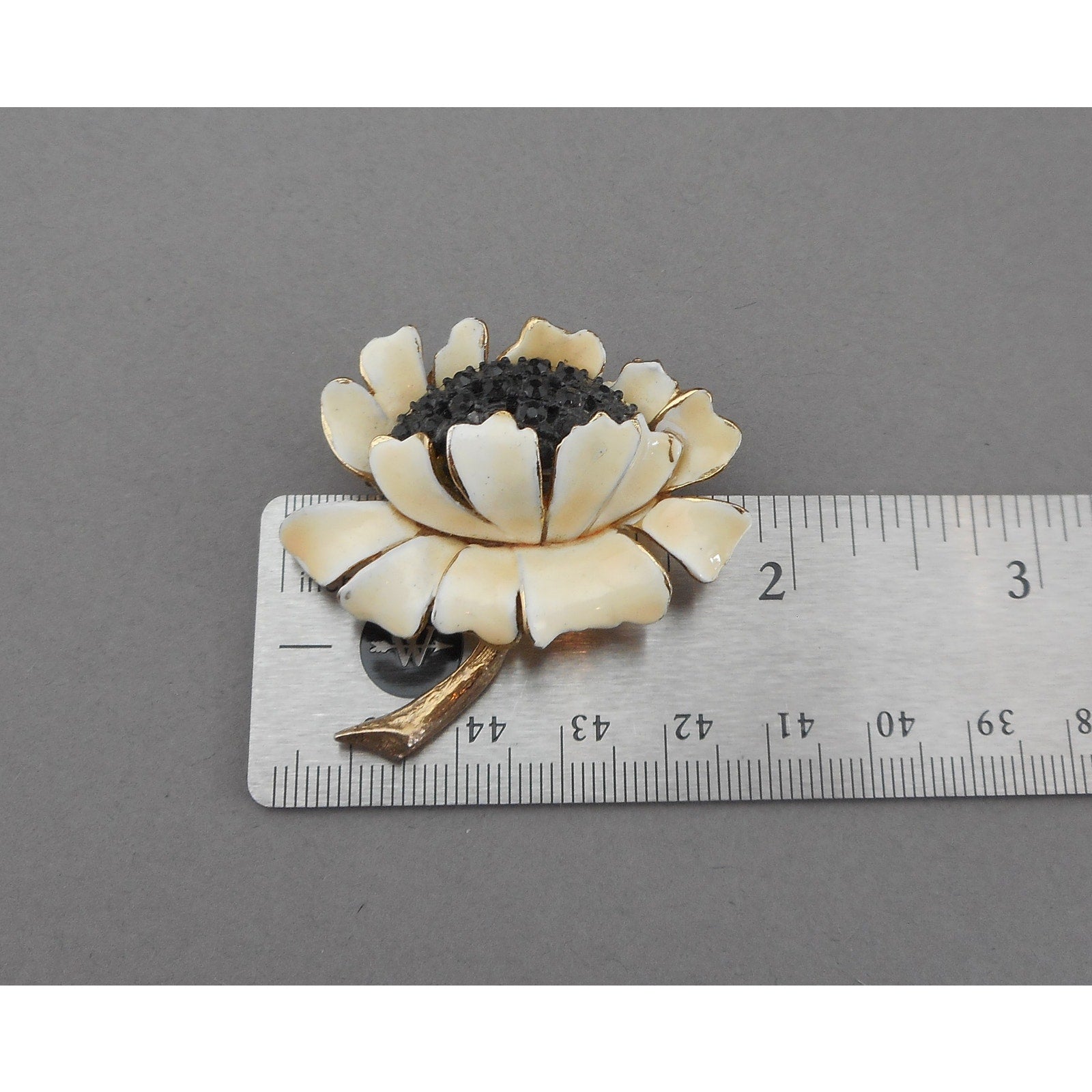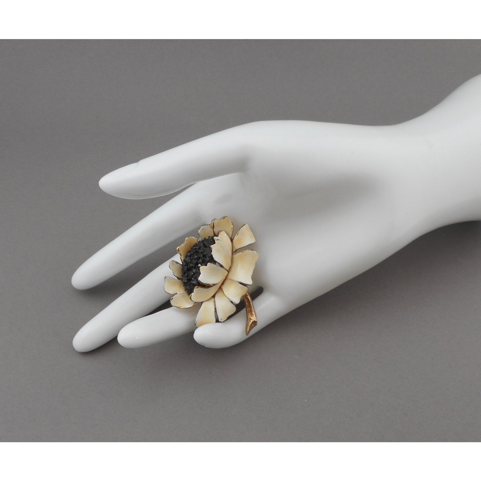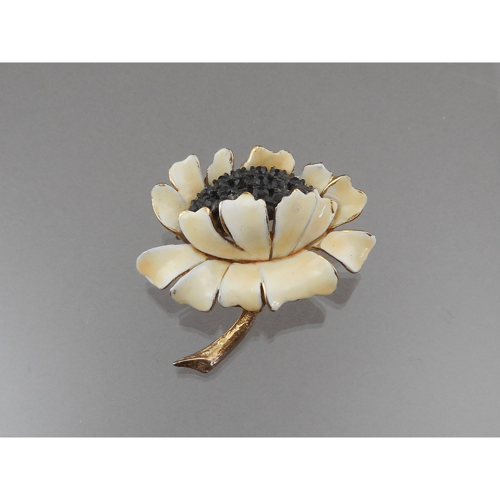 Vintage 1950s HAR Hargo Sunflower Brooch - Off White Enamel Flower Pin with Black Crystals / Rhinestones, Gold Tone - Mid Century Signed Designer Costume Jewelry
