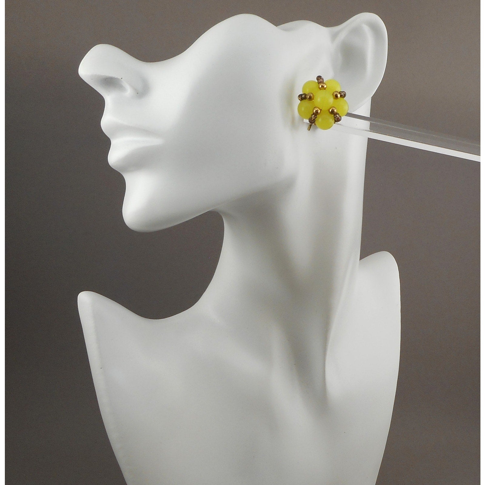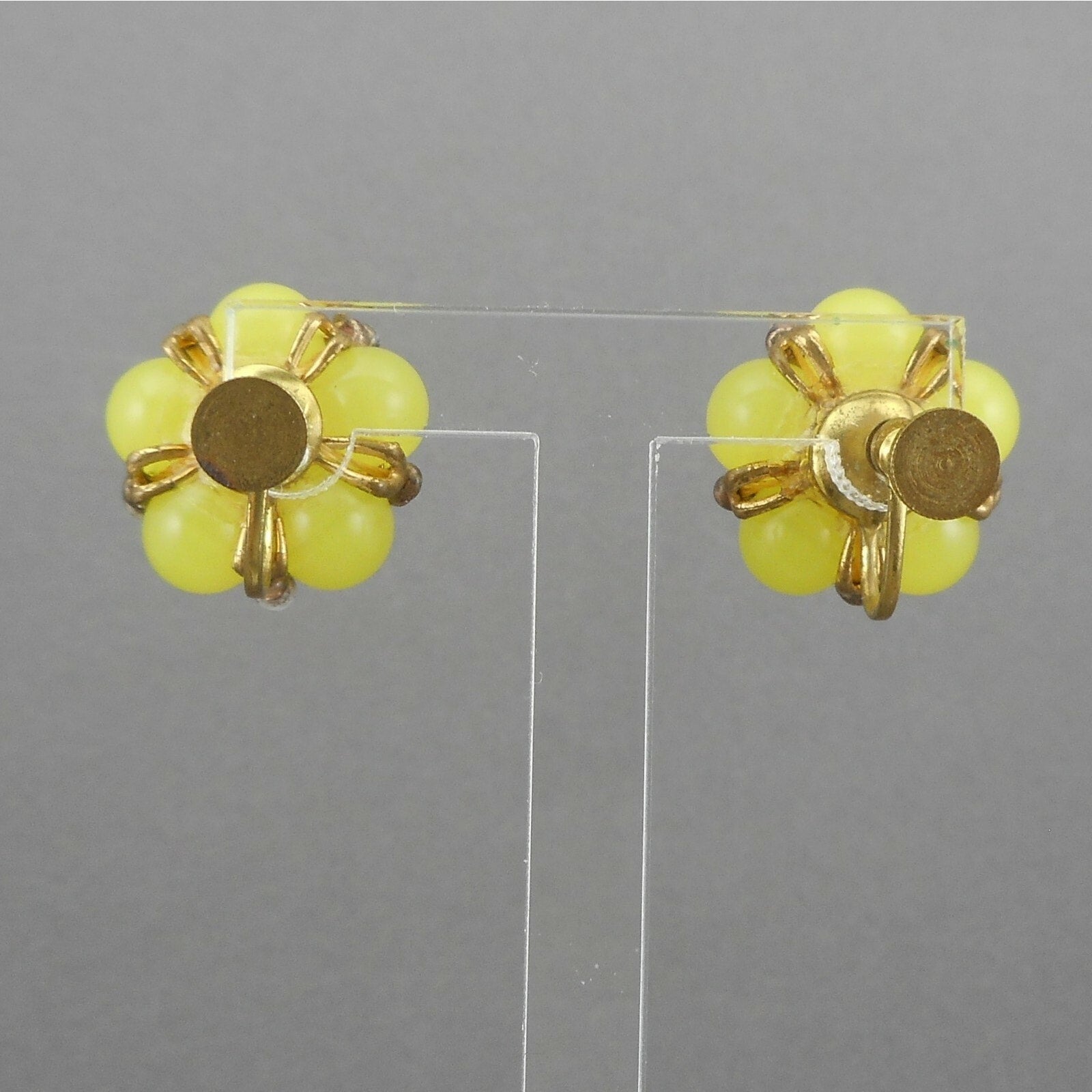 Vintage 1950s Screw Back Cluster Earrings - Flower Design, Yellow Plastic Beads