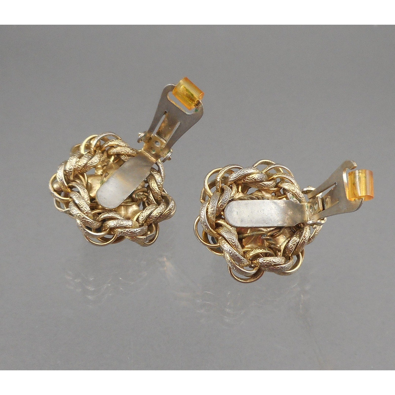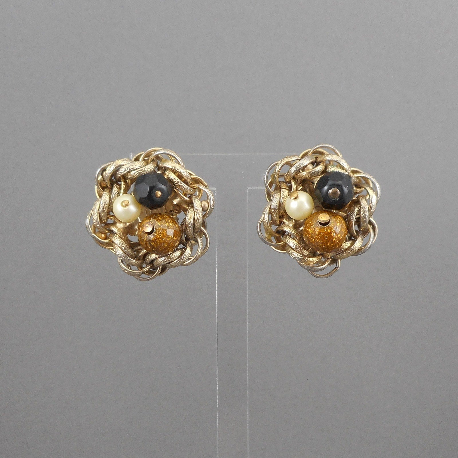 Vintage 1950s Signed Hobe´ Earrings - Faux Pearls, Black and Gold Beads, Gold Tone Rope Chain - Clip On, Cluster Design