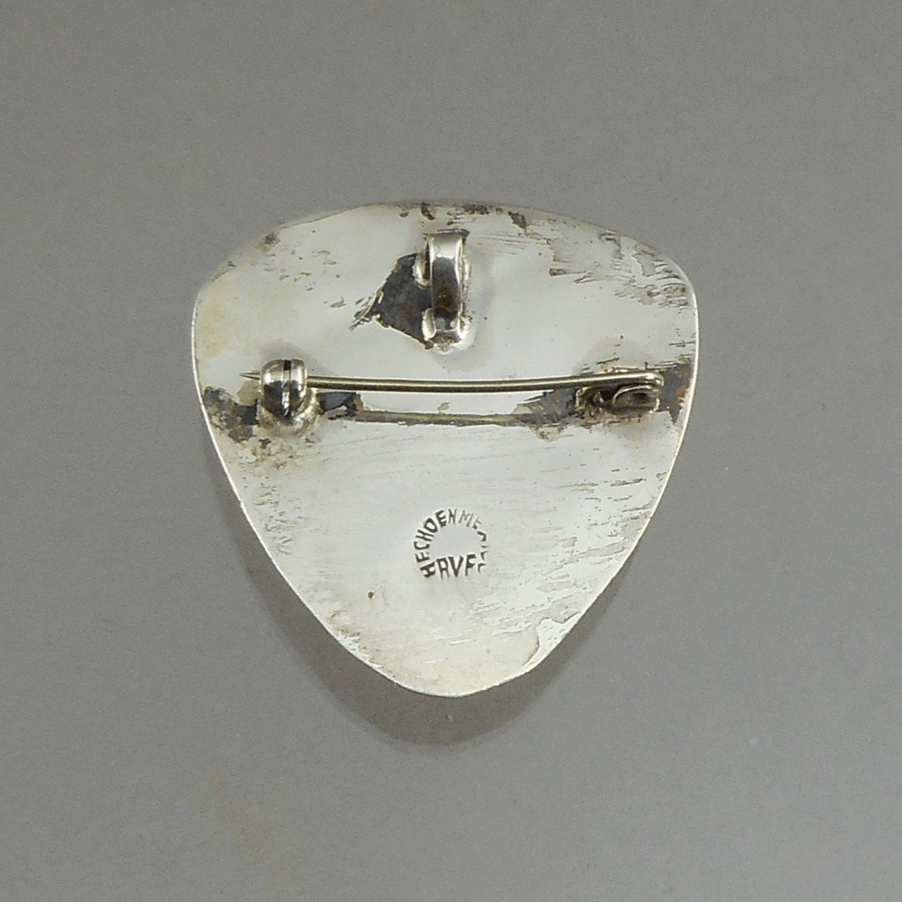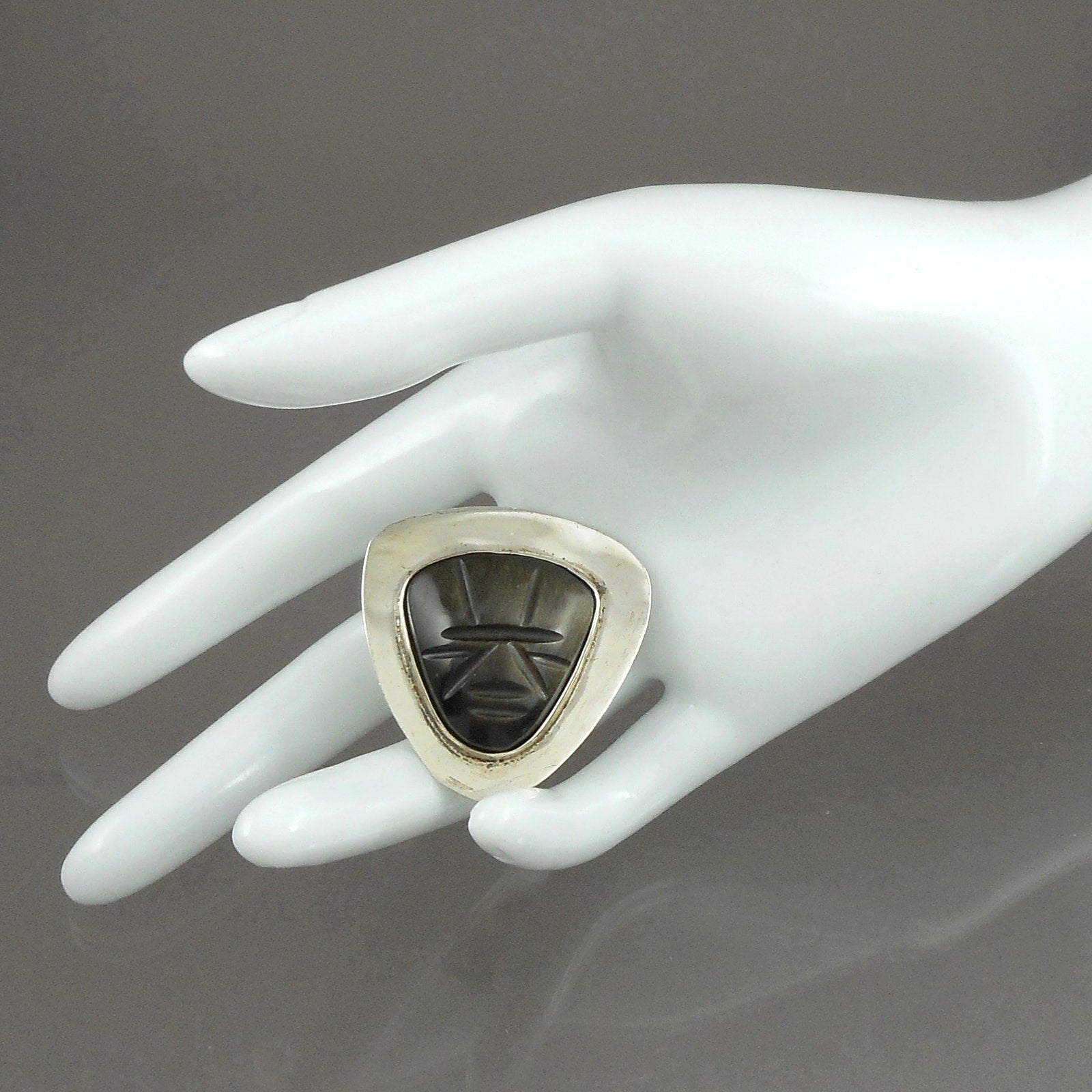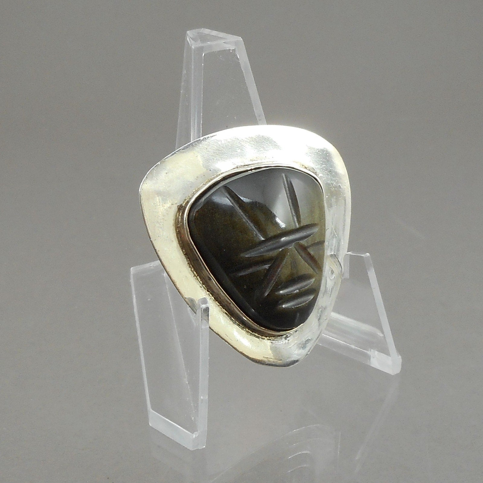 Vintage Handmade Mid Century Mexican Obsidian and Sterling Silver* Mask Brooch - Convertible Necklace Pendant / Pin - Signed RVF Mexico - Hand Carved Gold Black Stone Modernist Design