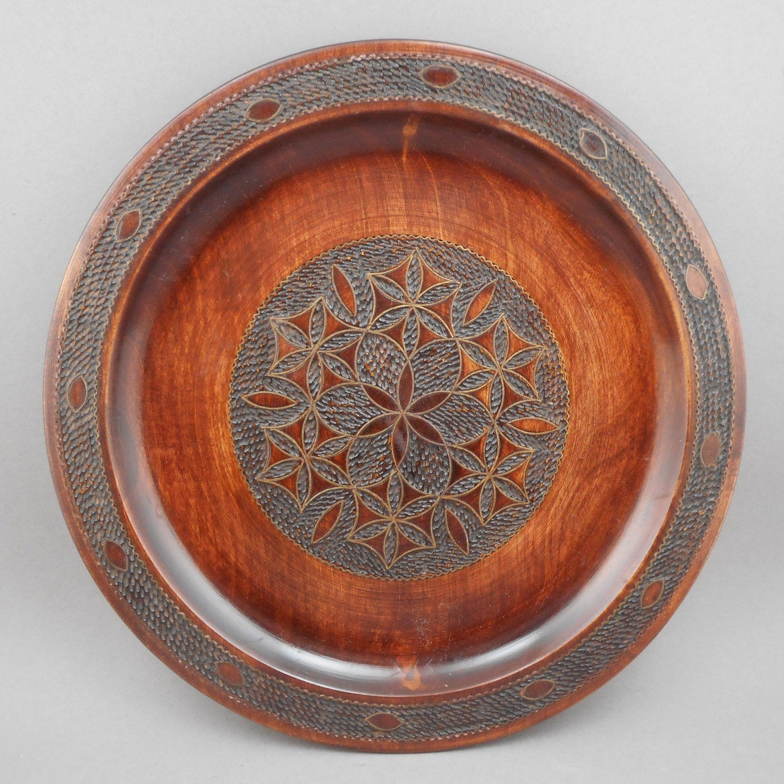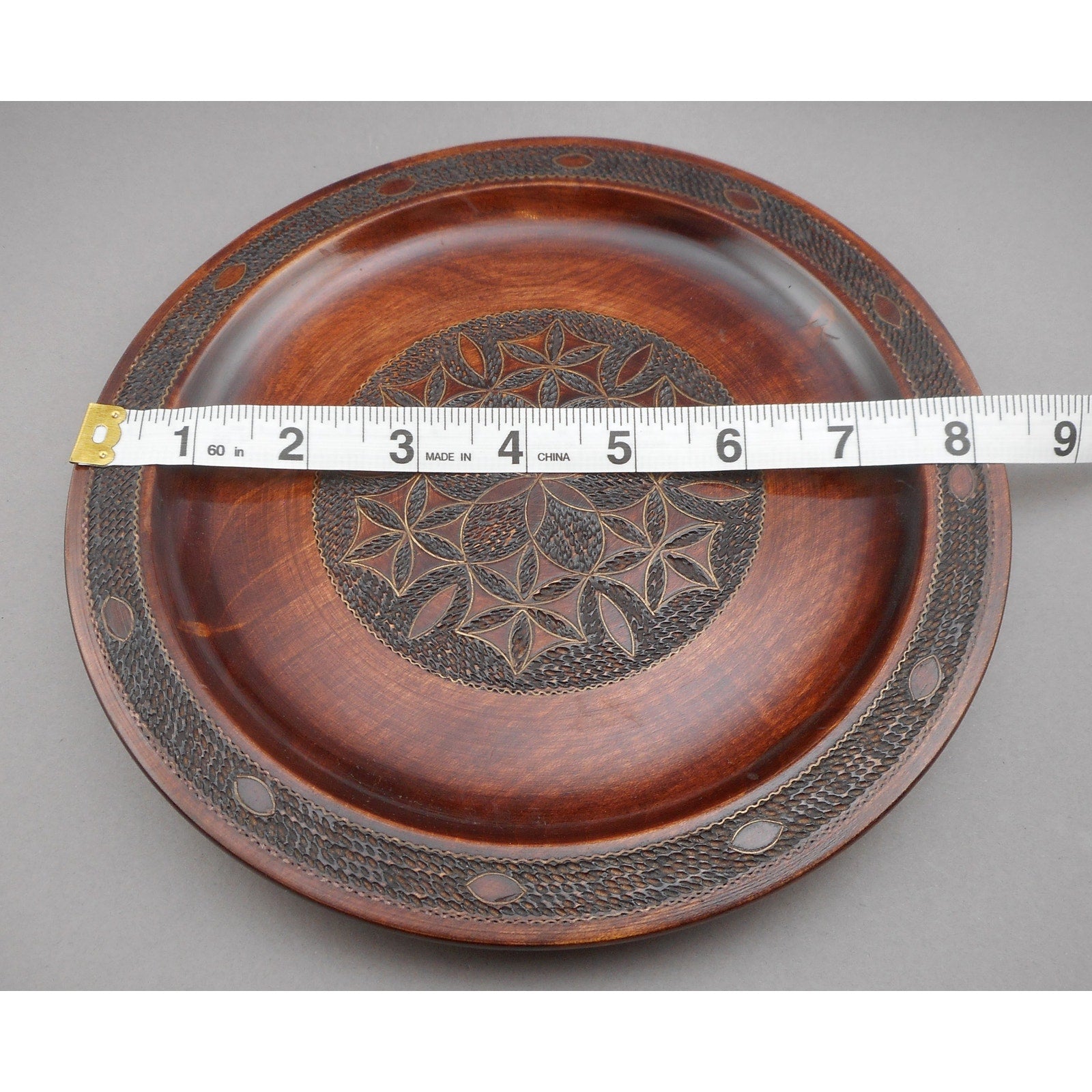 2 Vintage Polish Folk Art Hand Carved Wood Plates with Inlaid Brass Metal - Flower Designs - Made in Poland