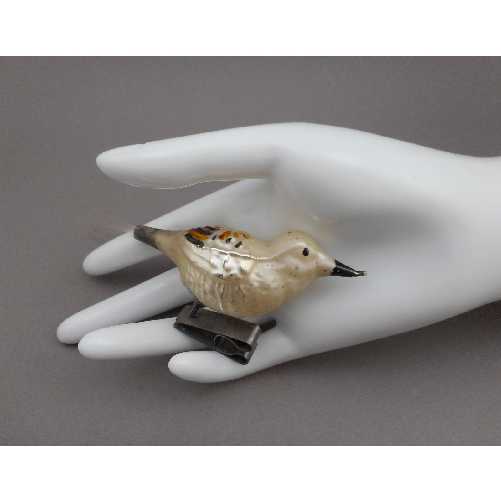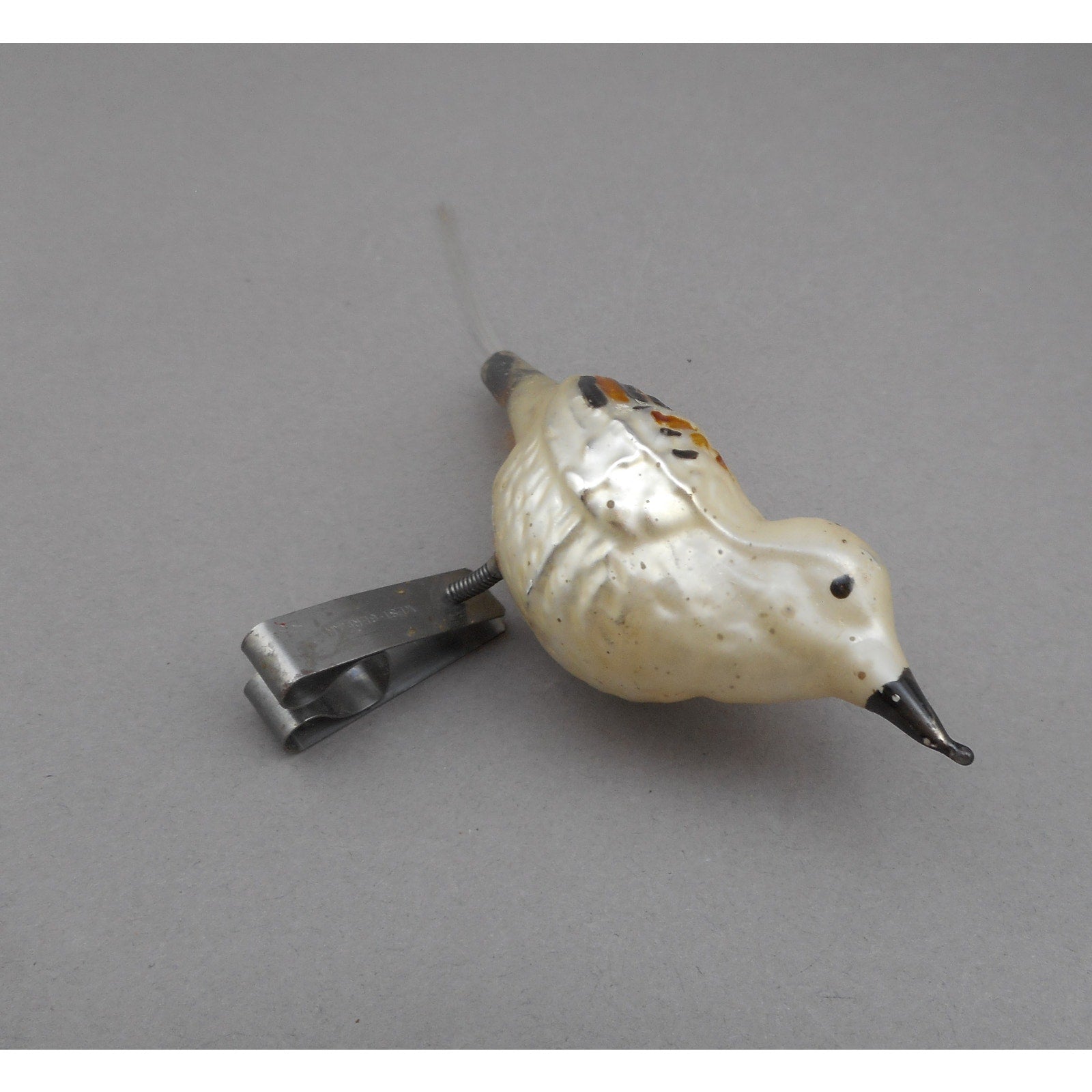 Antique or Vtg German Blown Glass Bird Christmas Ornament - Clip On, Spun Tail - Black White and Gold - Marked West Germany in the Clip