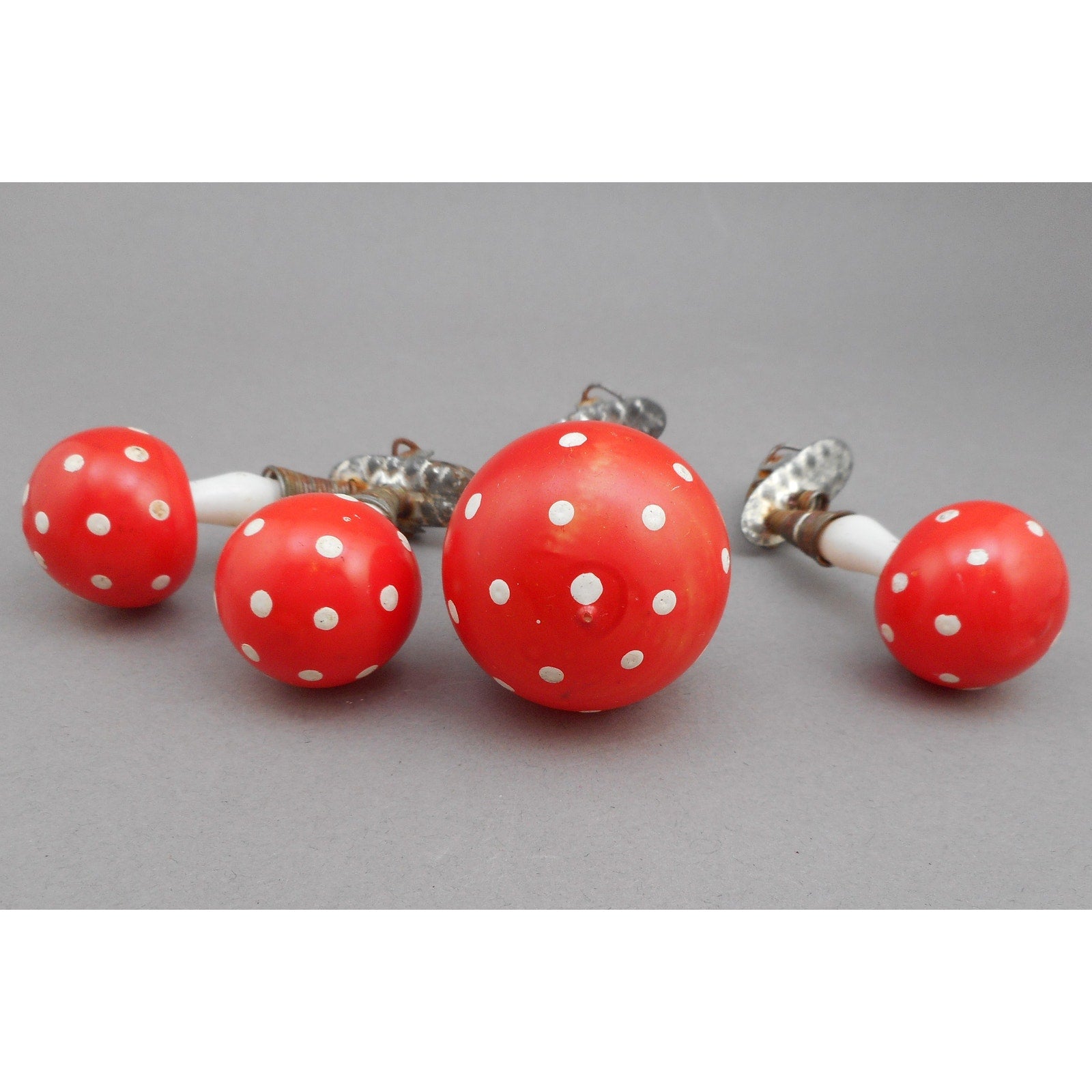 Antique Vtg German Blown Glass Mushroom Christmas Ornaments - Clip On - Lot of 3 - Double and Single - Red with White Polka Dots