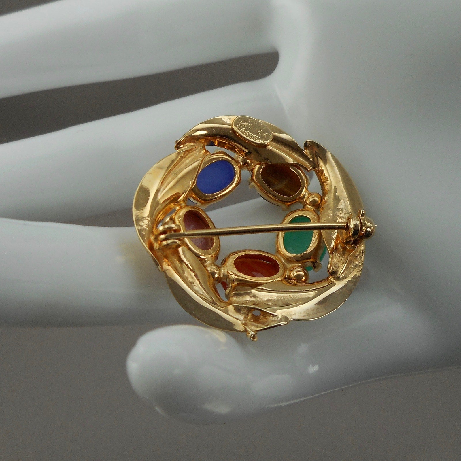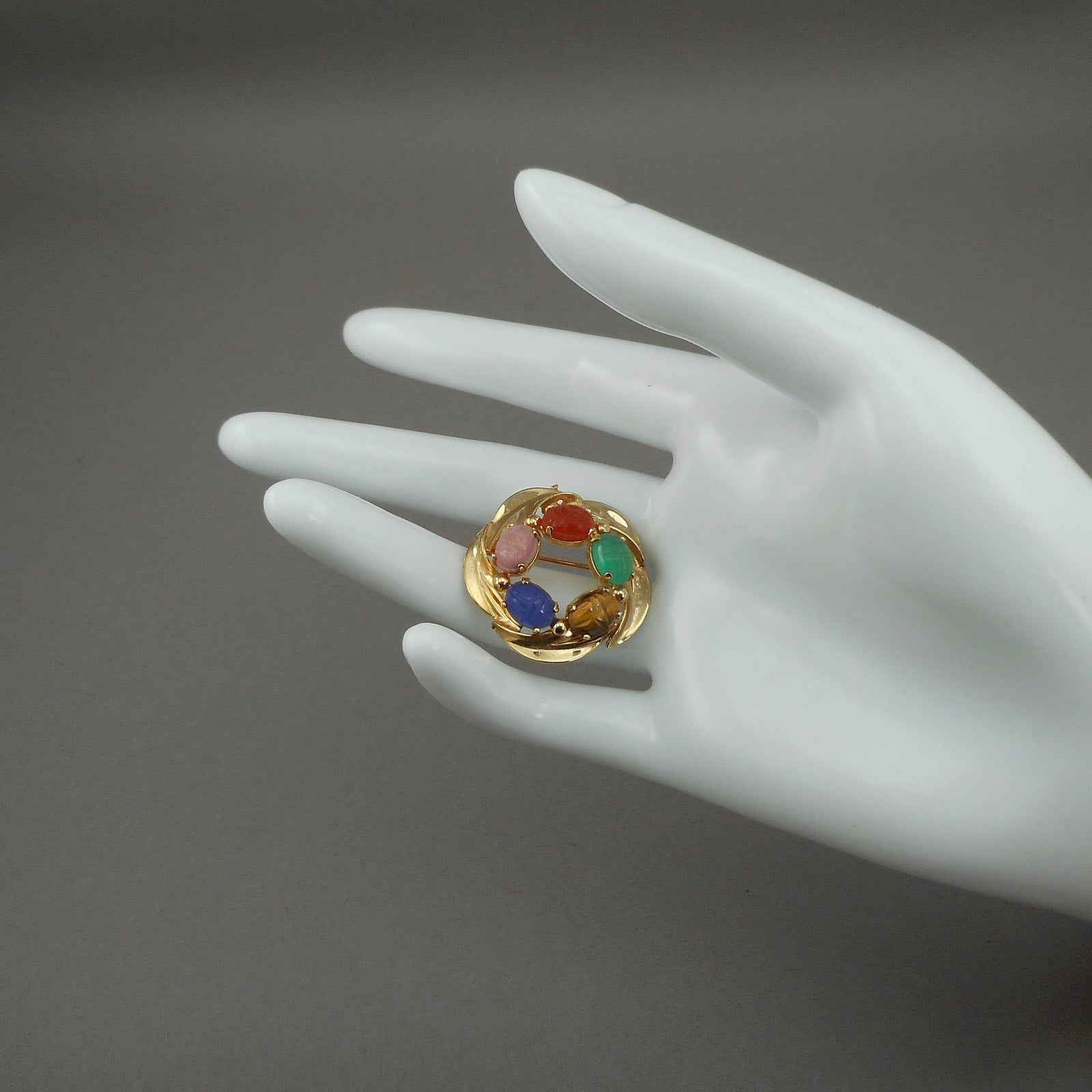 Excellent vintage pre-owned condition. Stones include tiger's eye, blue and green chalcedony, rhodolite and carnelian.