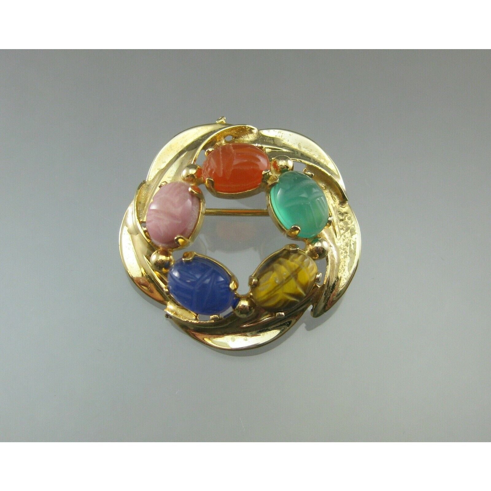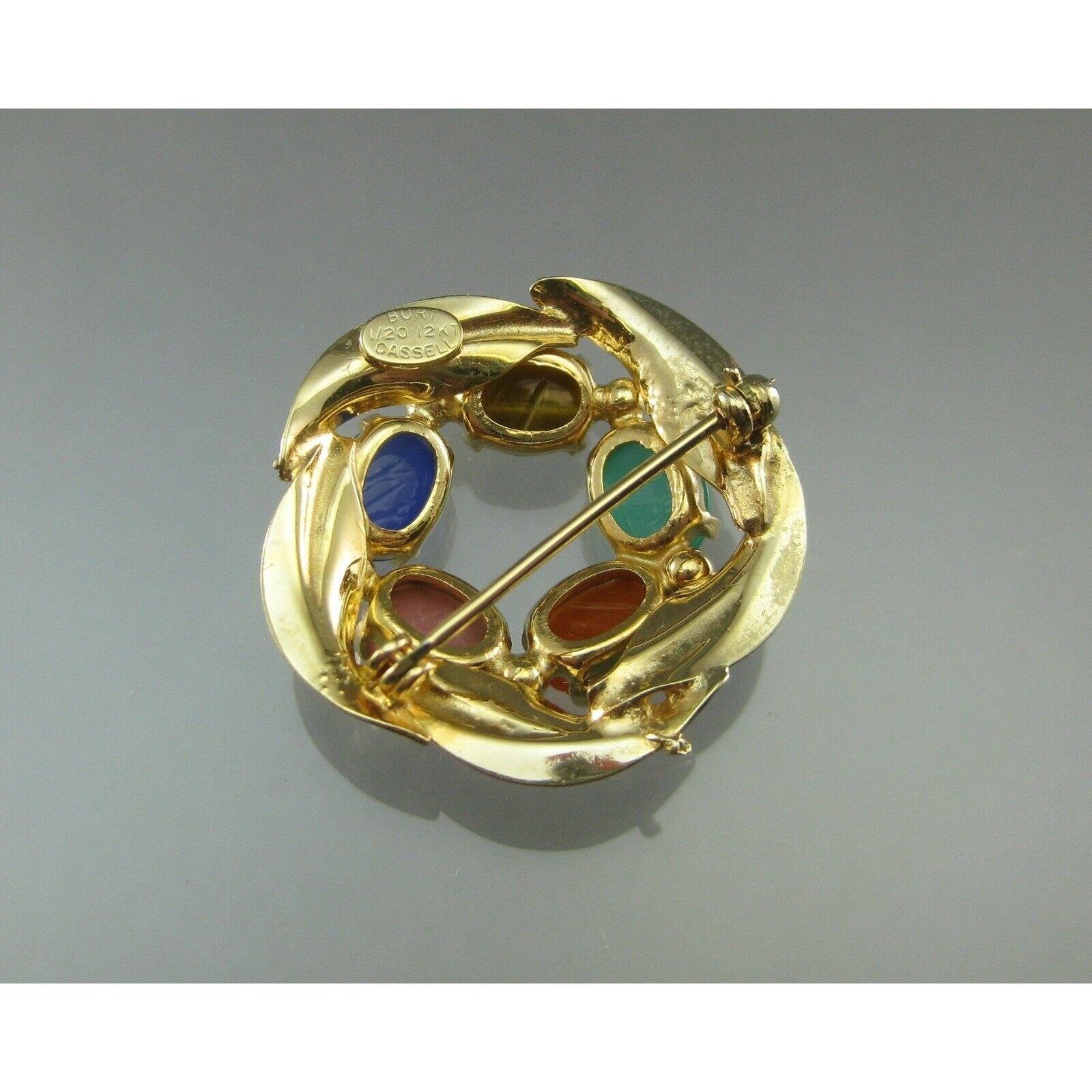 Excellent Vintage 12K Gold Filled Genuine Gemstone Egyptian Revival Brooch - circa 1960 by Burt Cassell - Scarab Pin with Semiprecious Stones - Tiger's Eye, Blue and Green Chalcedony, Rhodolite and Carnelian