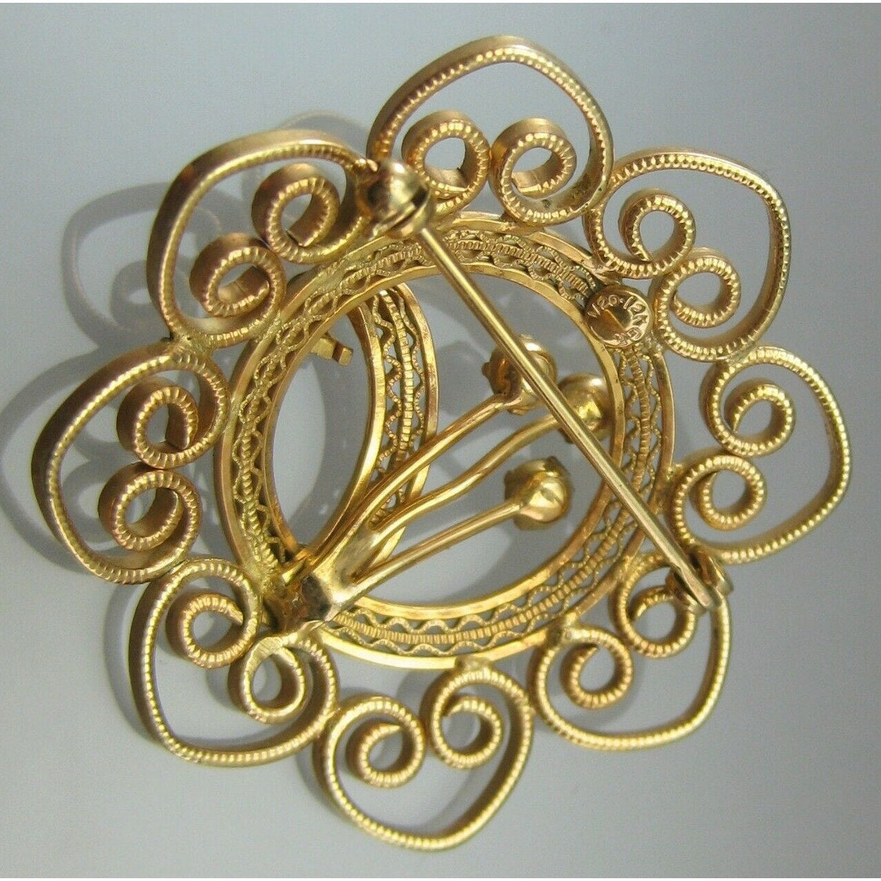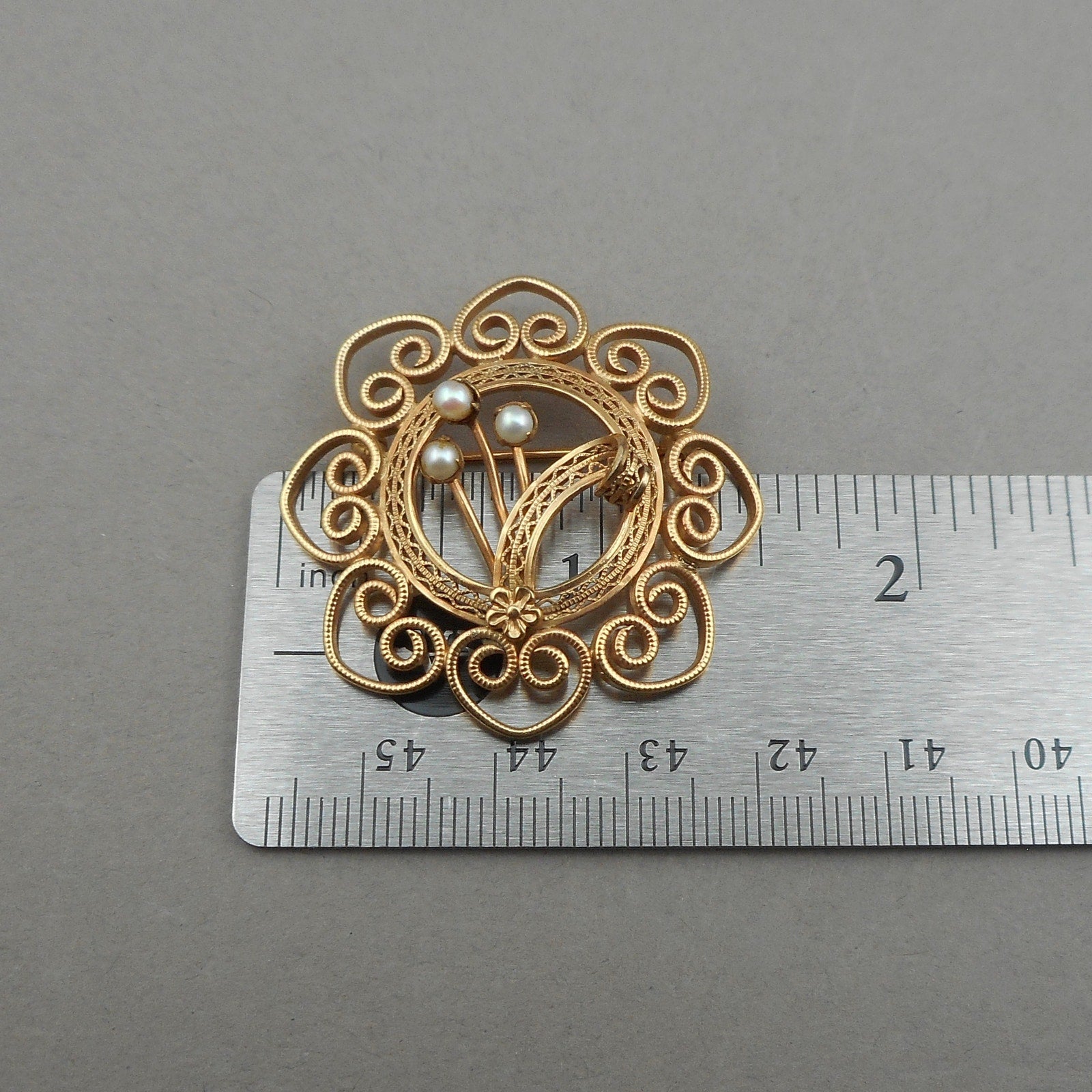 Excellent Vintage 1950s 1/20 12K Gold Filled Filigree Brooch Pin with Genuine Pearls - Mid Century Modern Era - Flowers, Leaf, Wreath and Hearts