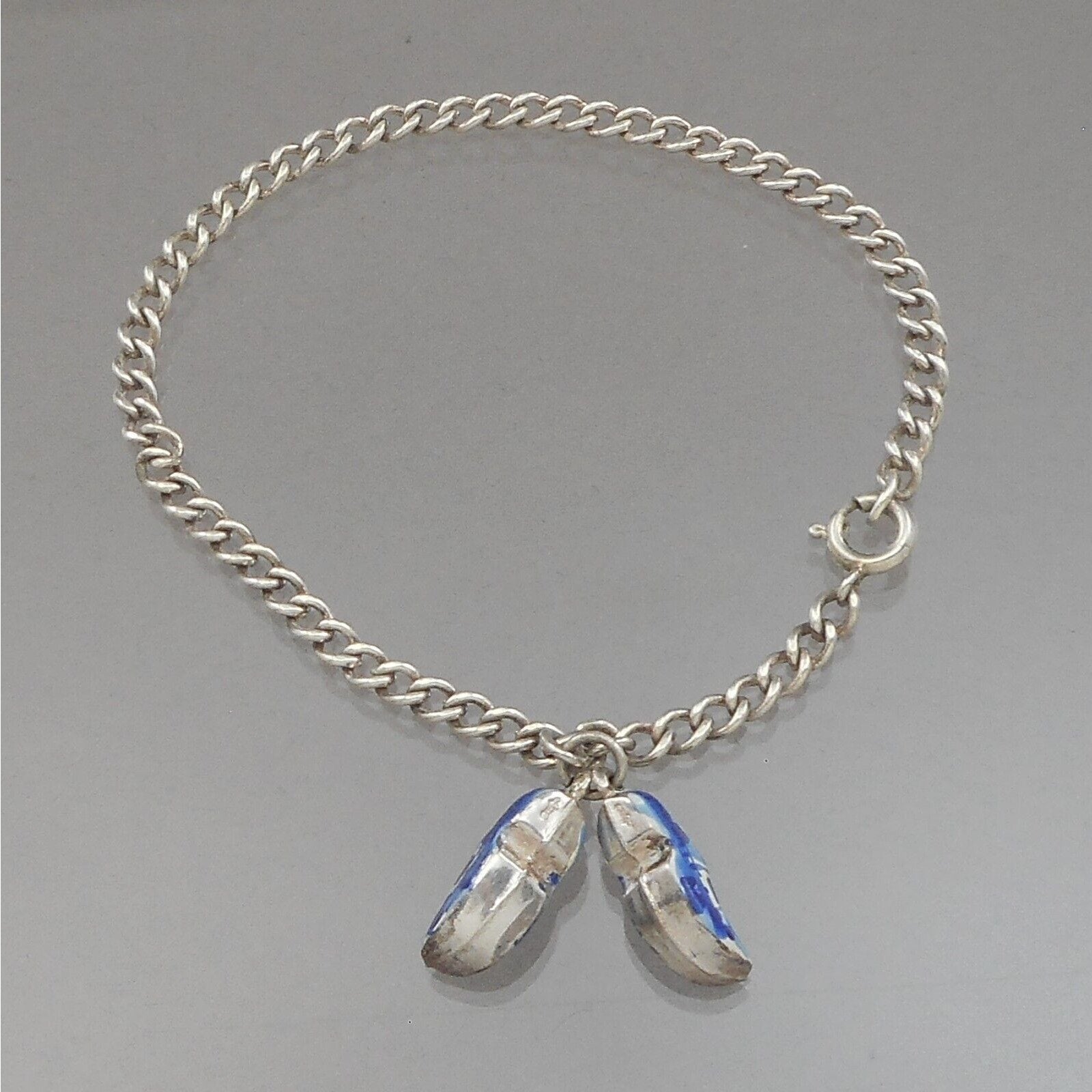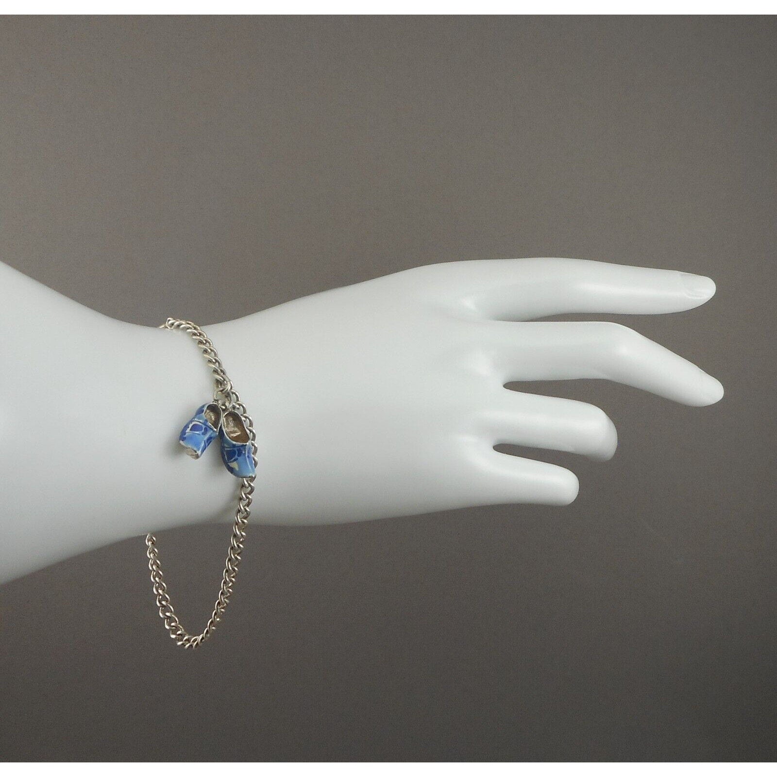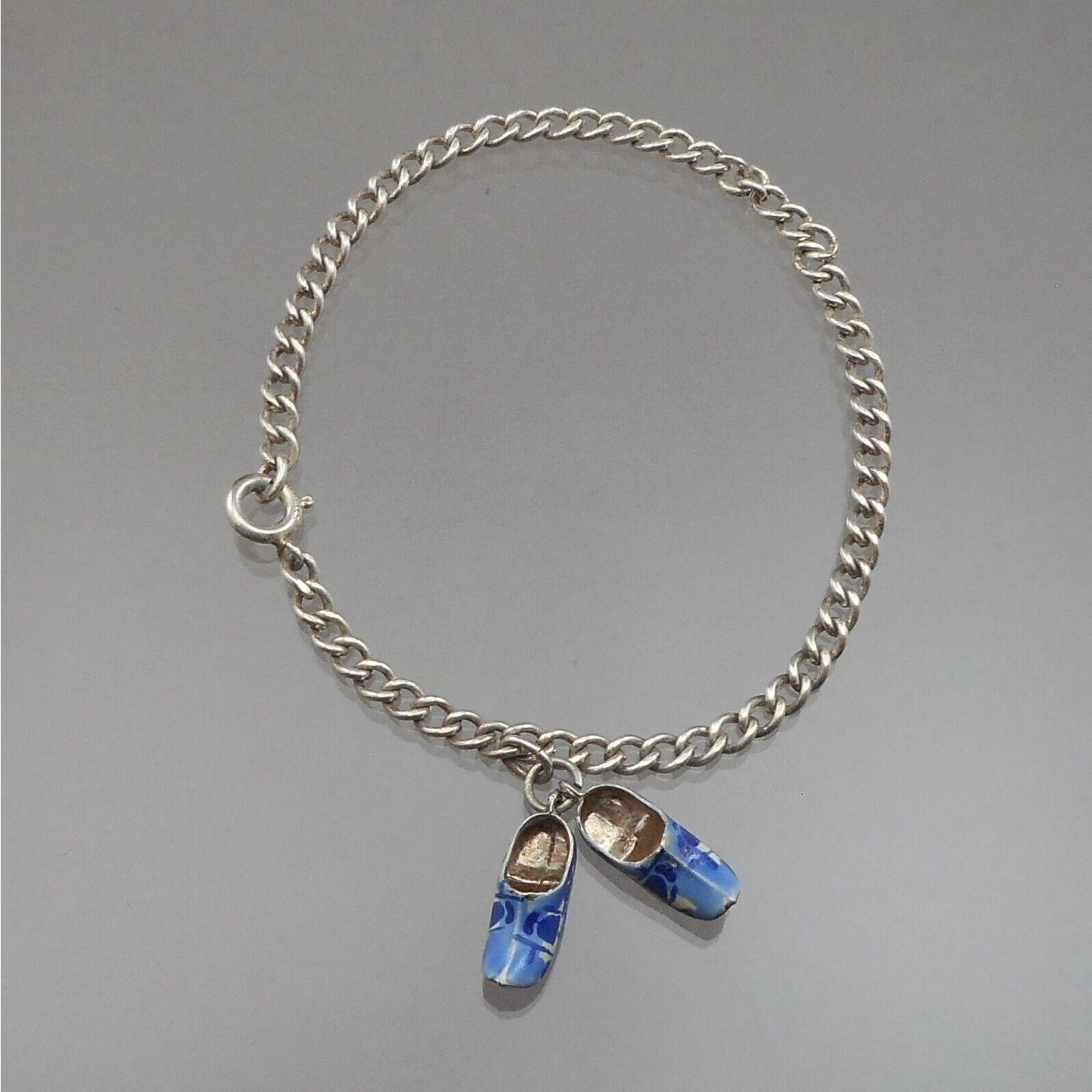 Vintage Dutch Delft Style Shoe Charms - 835 Silver on Sterling Chain Bracelet - Blue and White - Holland Souvenir