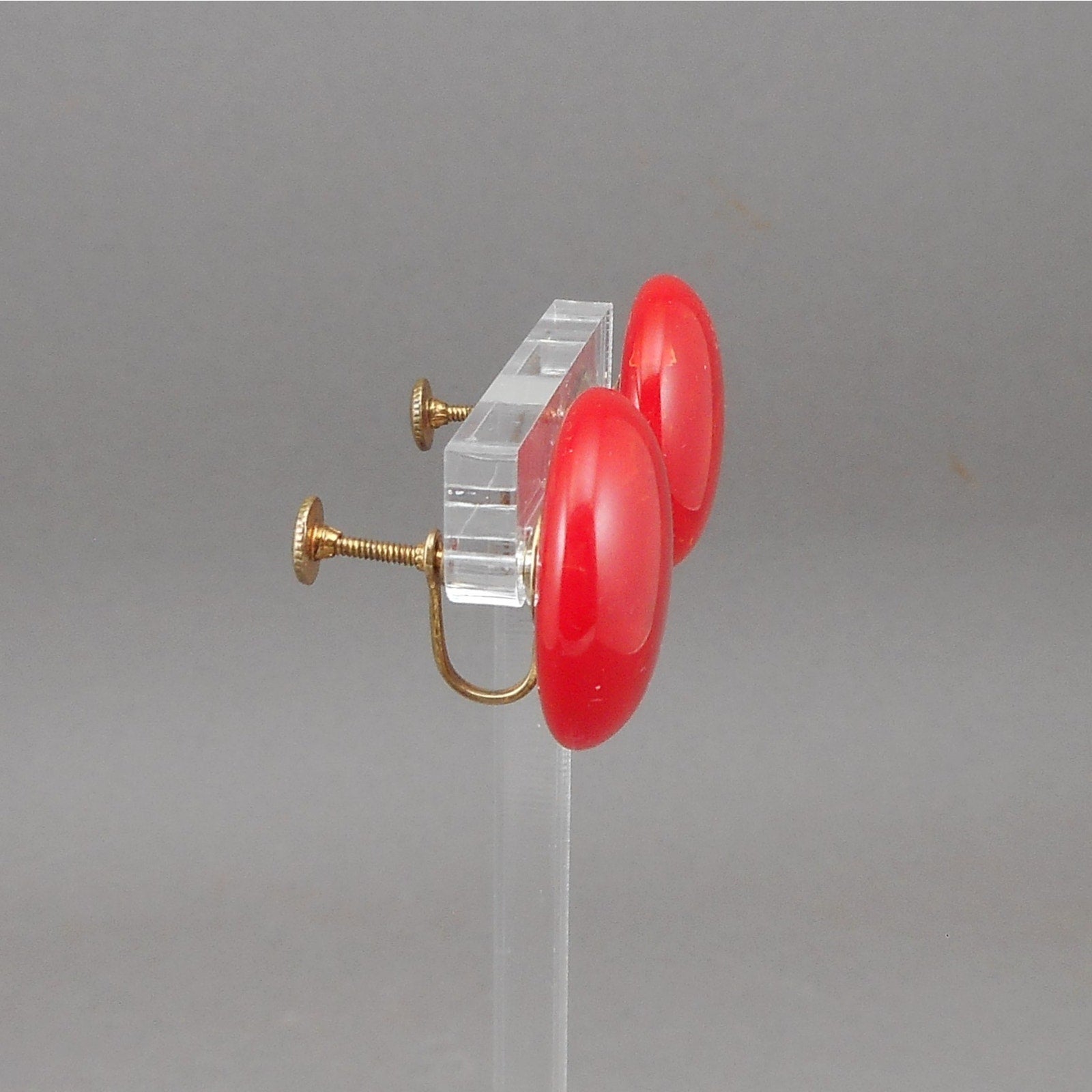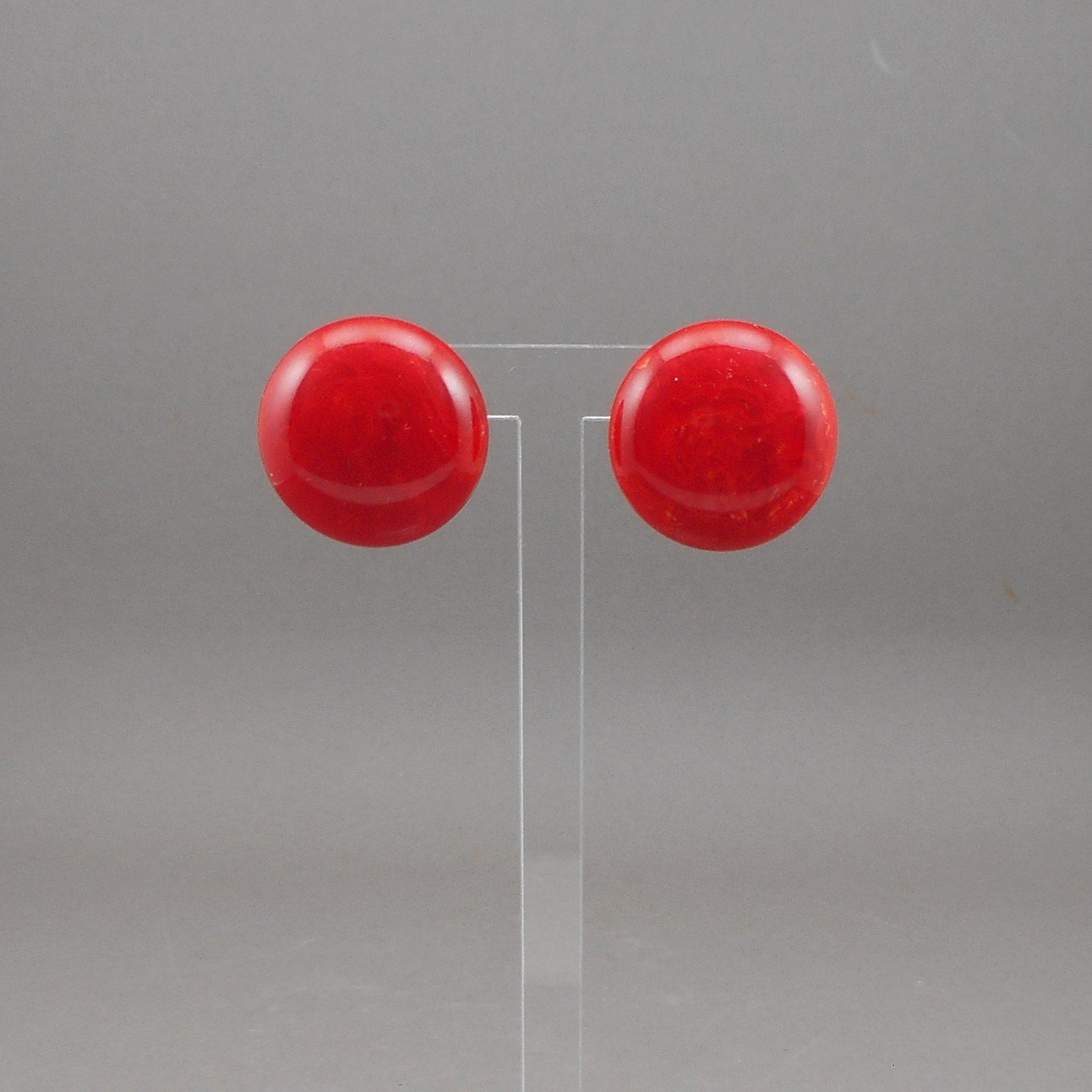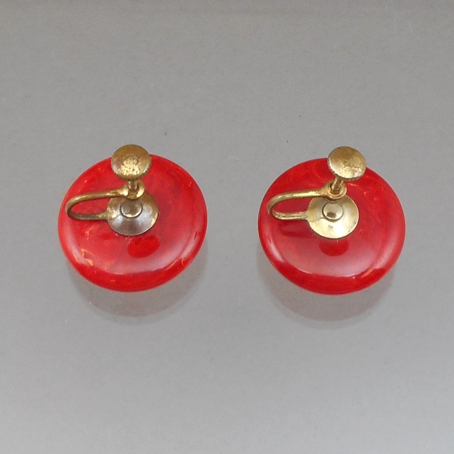 Vintage 1930s / 1940s Bakelite Earrings - Cherry Red Marble - Button Style with Screw Backs - Early Plastic Estate Costume Jewelry