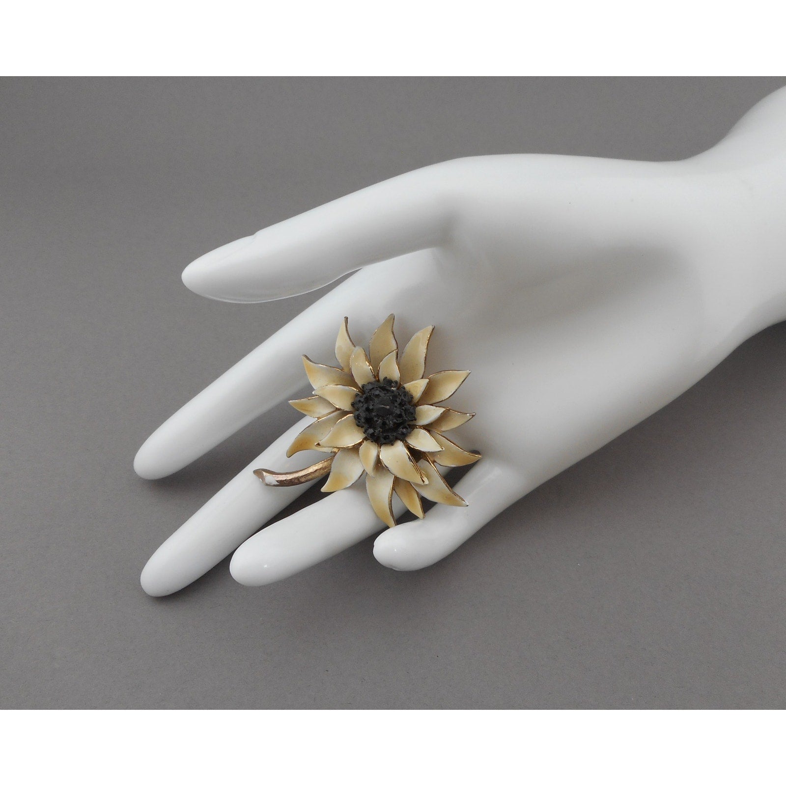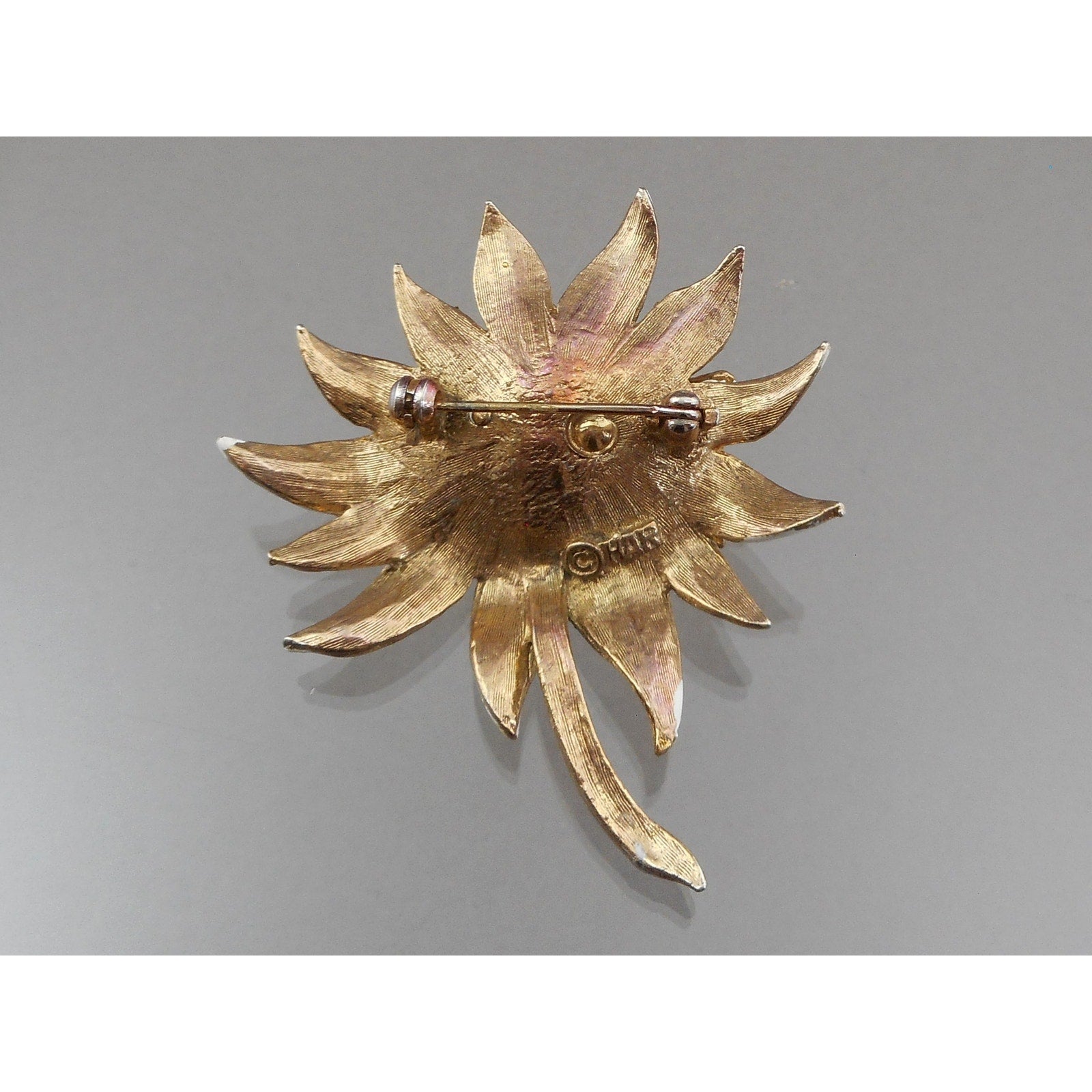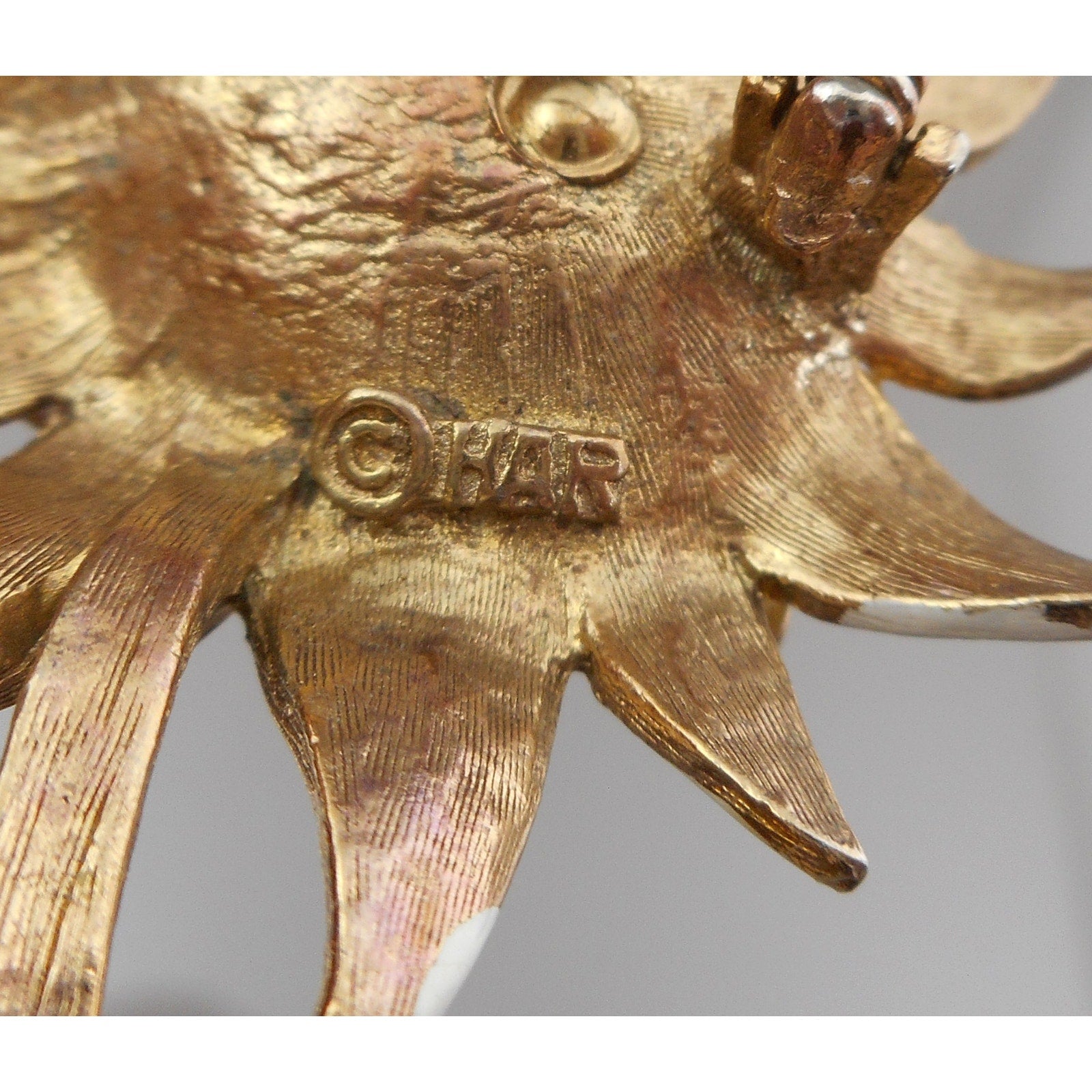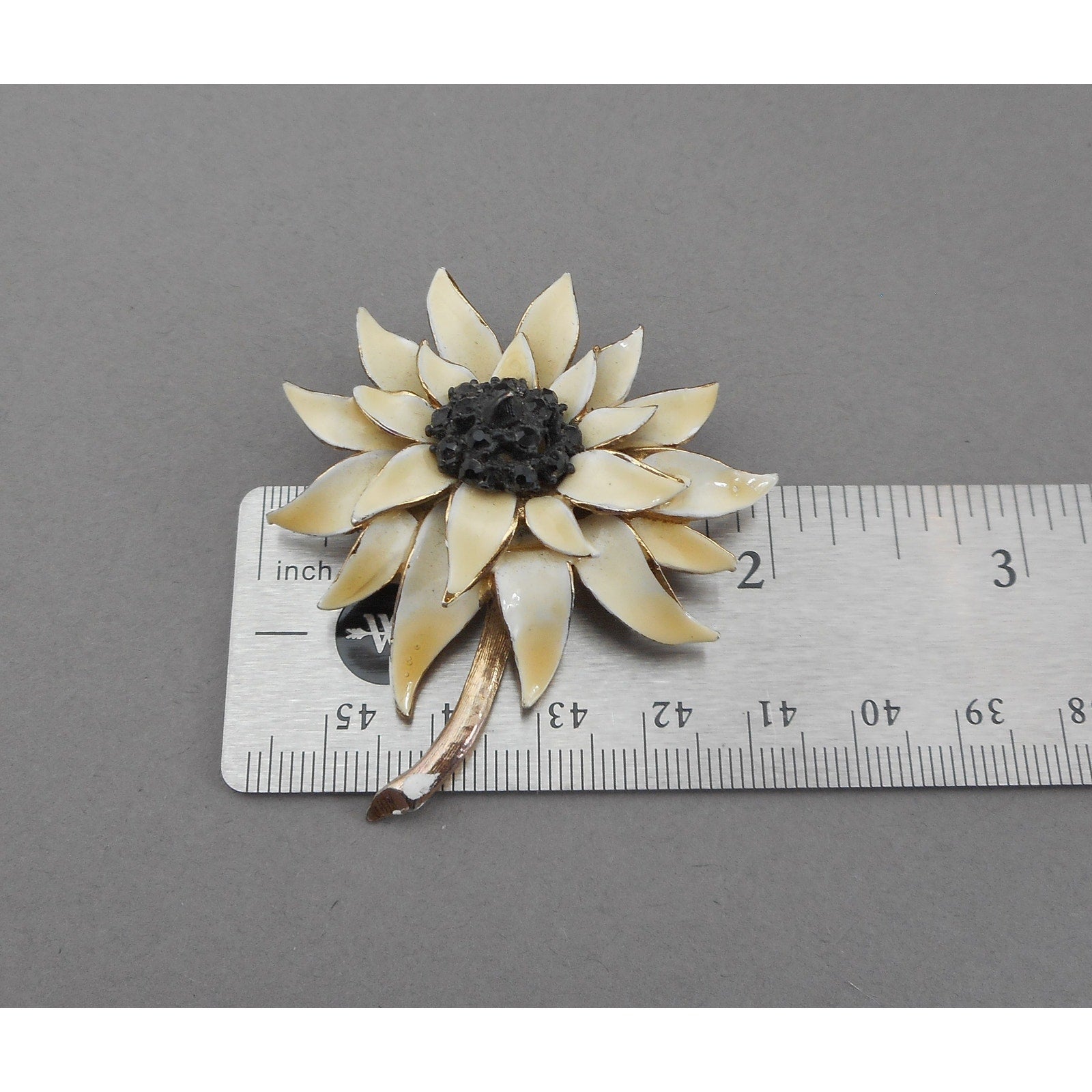 Vintage 1950s HAR Hargo Flower Brooch Pin - Off White Enamel with Black Crystals / Rhinestones, Gold Tone - Mid Century Signed Designer Costume Jewelry