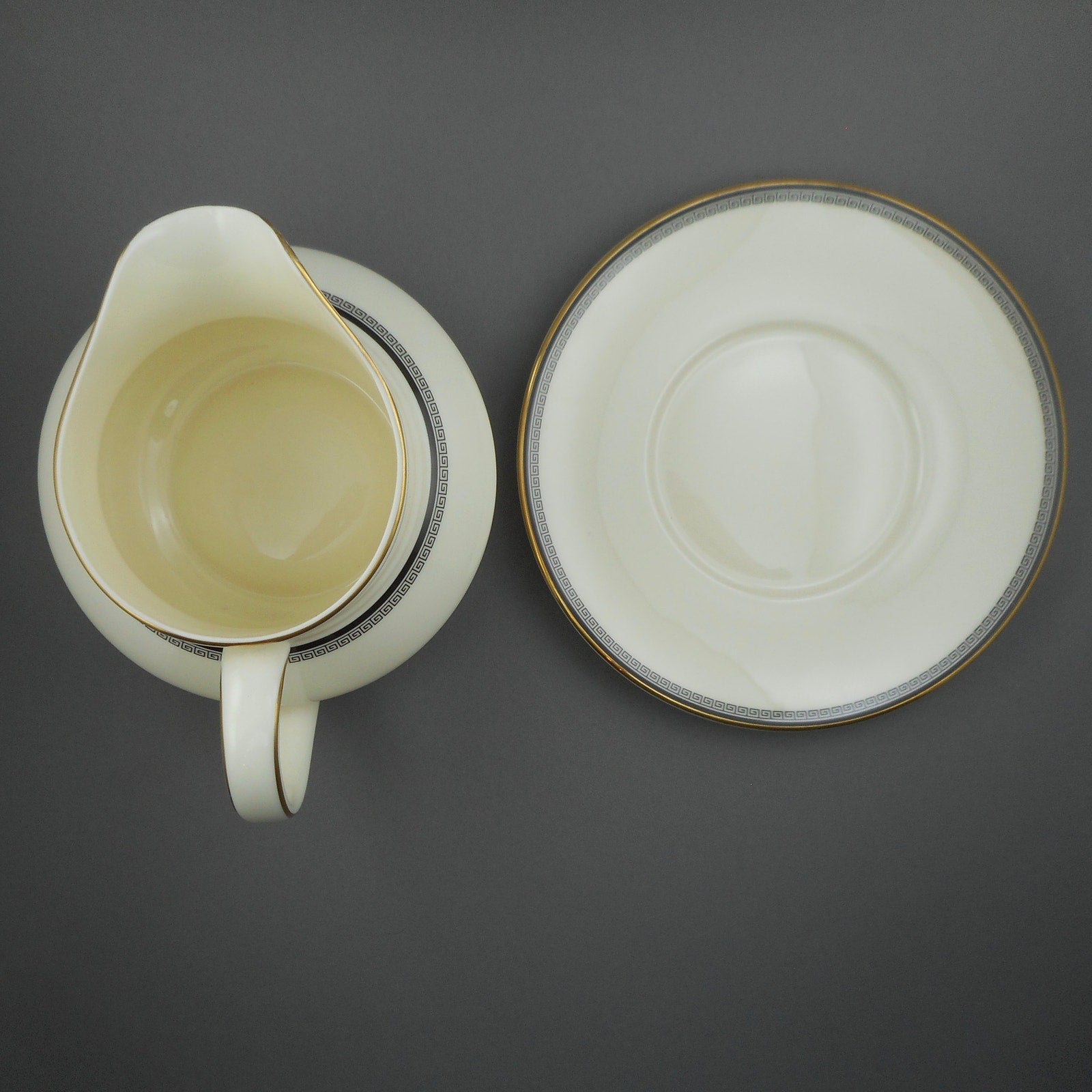Pre-owned condition - free of chips, cracks and crazing. A little wear to the gilding at the rim, spots of paint on the underside of the pitcher, likely picked up from a shelf.