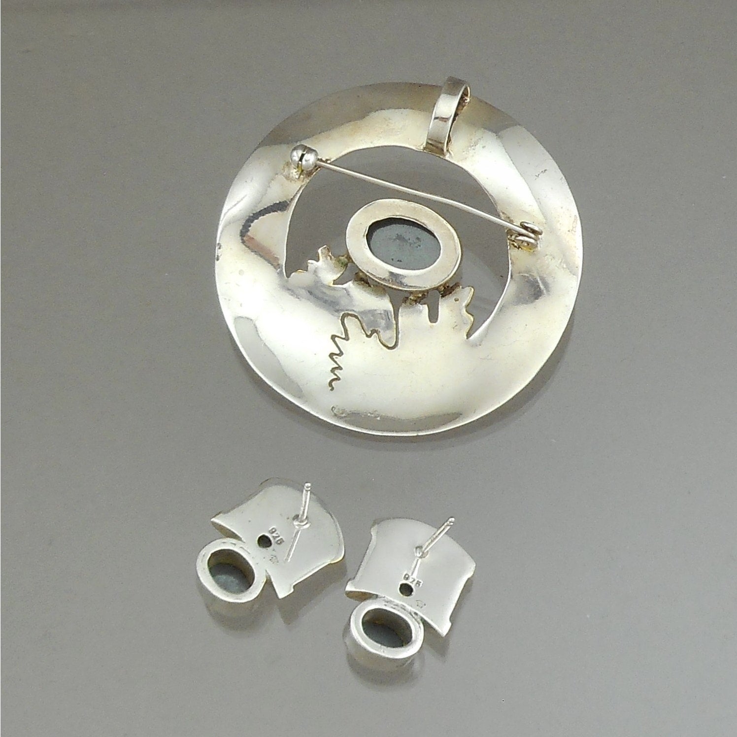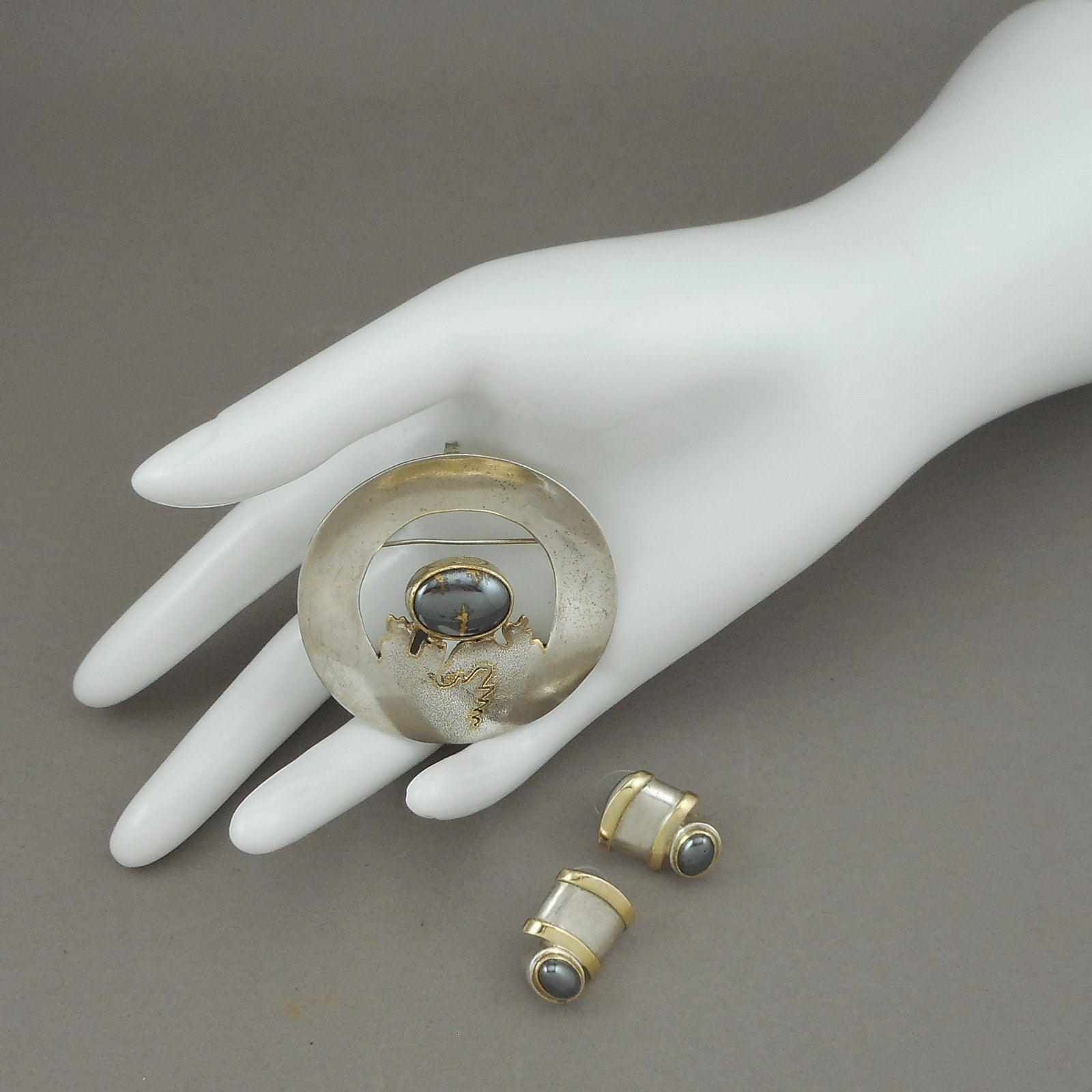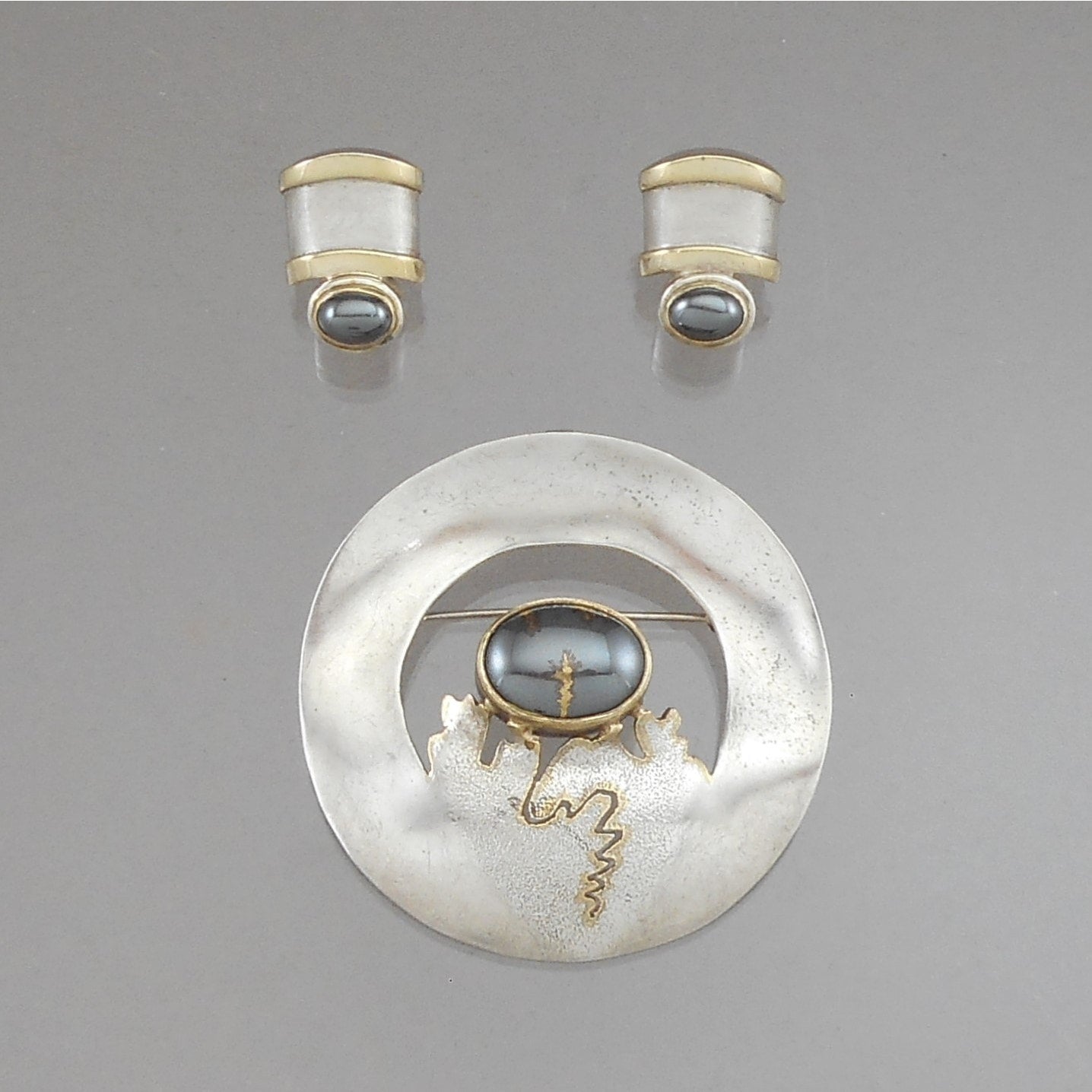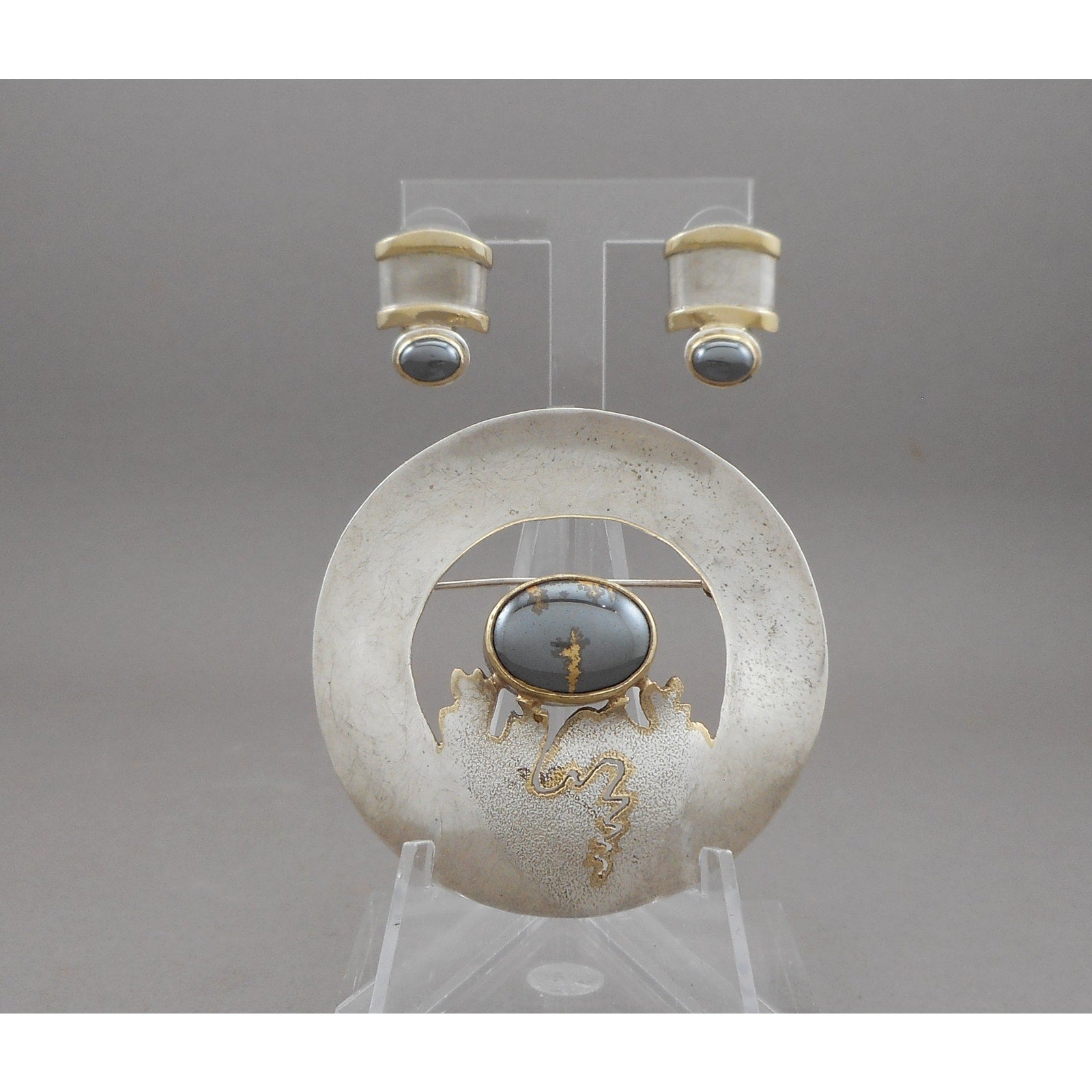 Vintage Artisan Crafted Hematite Sterling Silver Jewelry Set - Southwestern Style Brooch / Pendant and Earrings - Hand Made, Hematite, Sterling Silver and Gold Pin