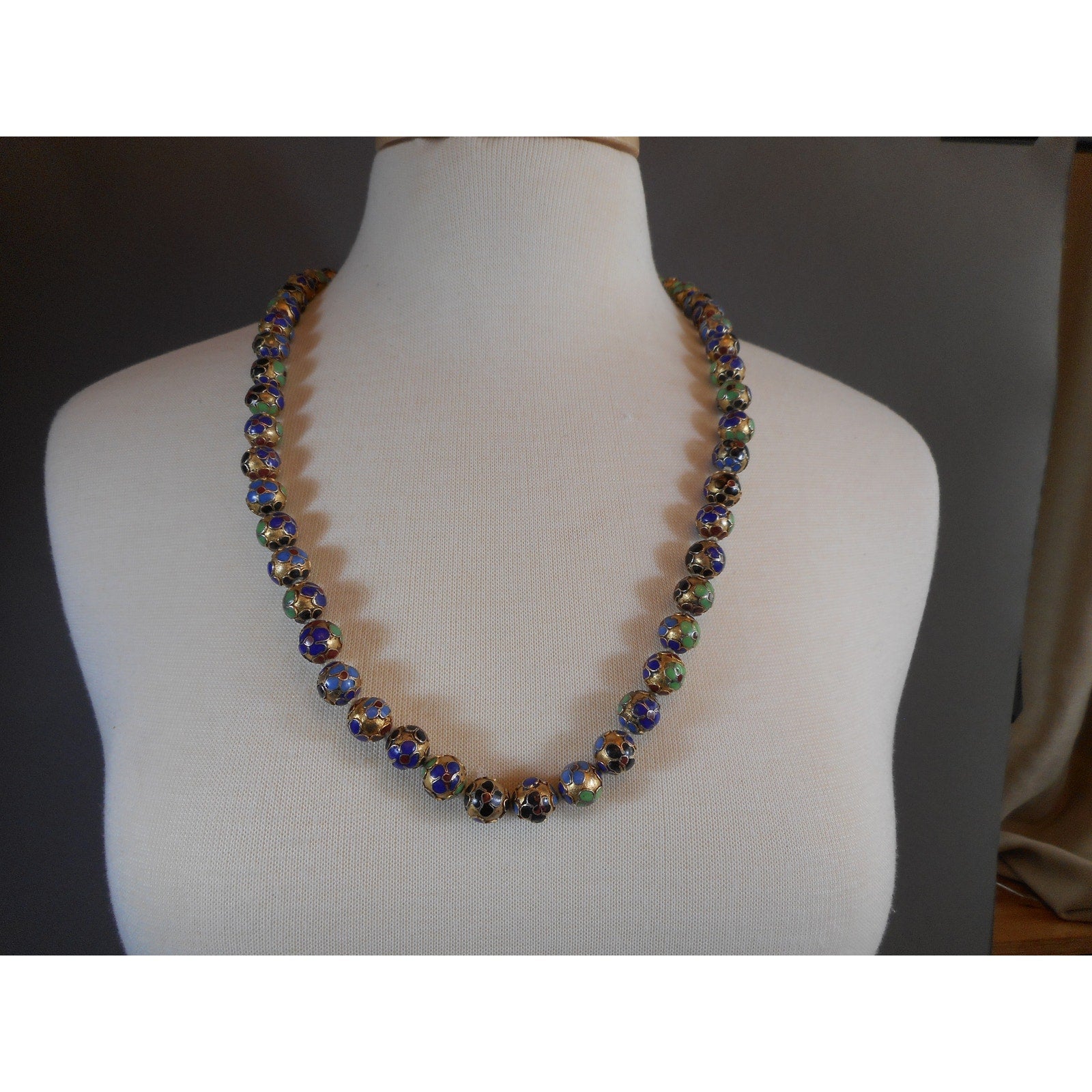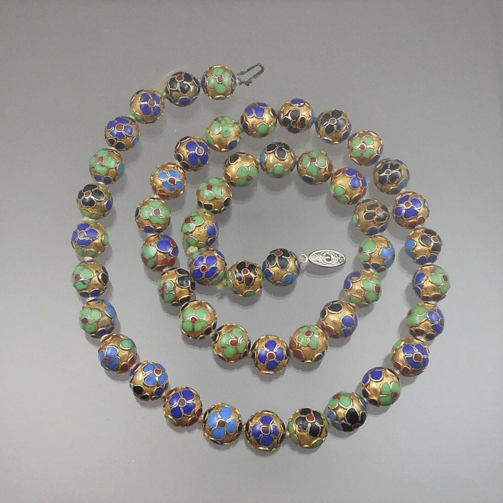 A vintage hand knotted cloisonne enamel Chinese bead necklace. Maker unknown, matinee length. Gold tone or plated beads with multi-color glass enamel flower decoration.