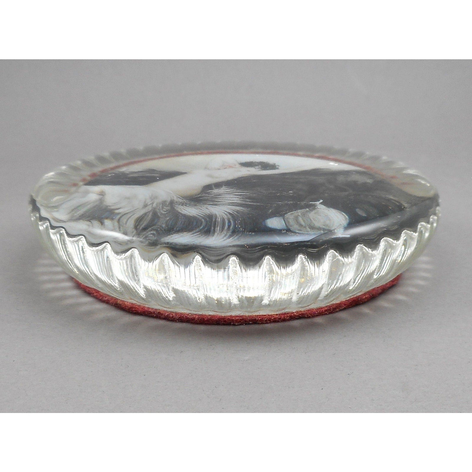 An old glass paperweight featuring a print of an Art Deco era etching by French artist Louis Icart (1888-1950). The felt underside is a more recent replacement. One of a collection we recently acquired, the others will be offered in our shop as well.