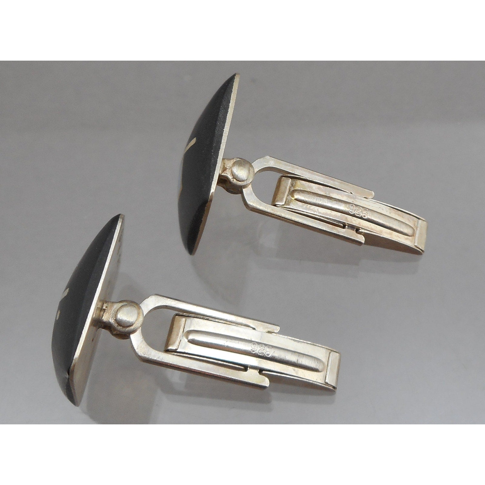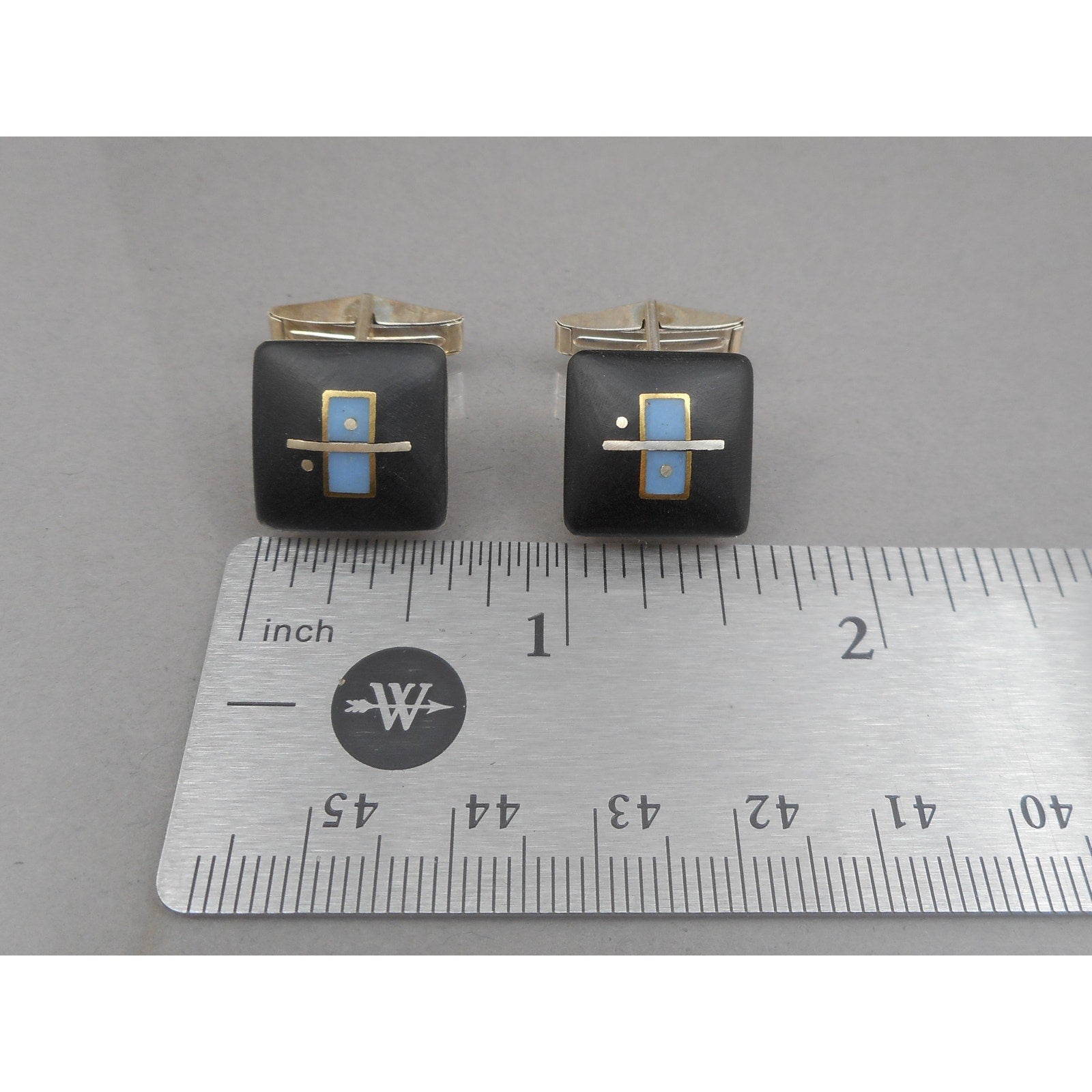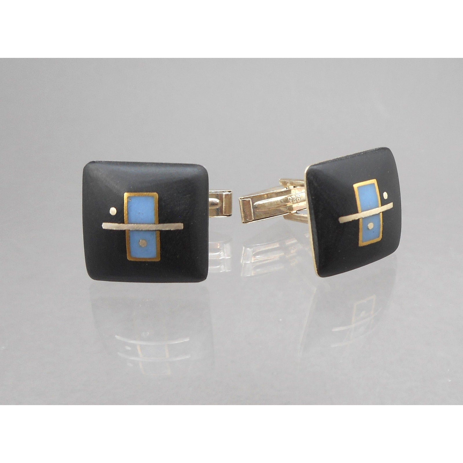 Vintage Handmade Eileen Sutton Jewelry Cufflinks - Signed, US Artisan Crafted Studio Jewelry of Mixed Materials - Post Modern Style Design - 14k Yellow Gold Filled Sterling Silver, Black Cast Resin with Blue Resin Inlay - Hinged Sterling Silver Backings - Hand Made in USA