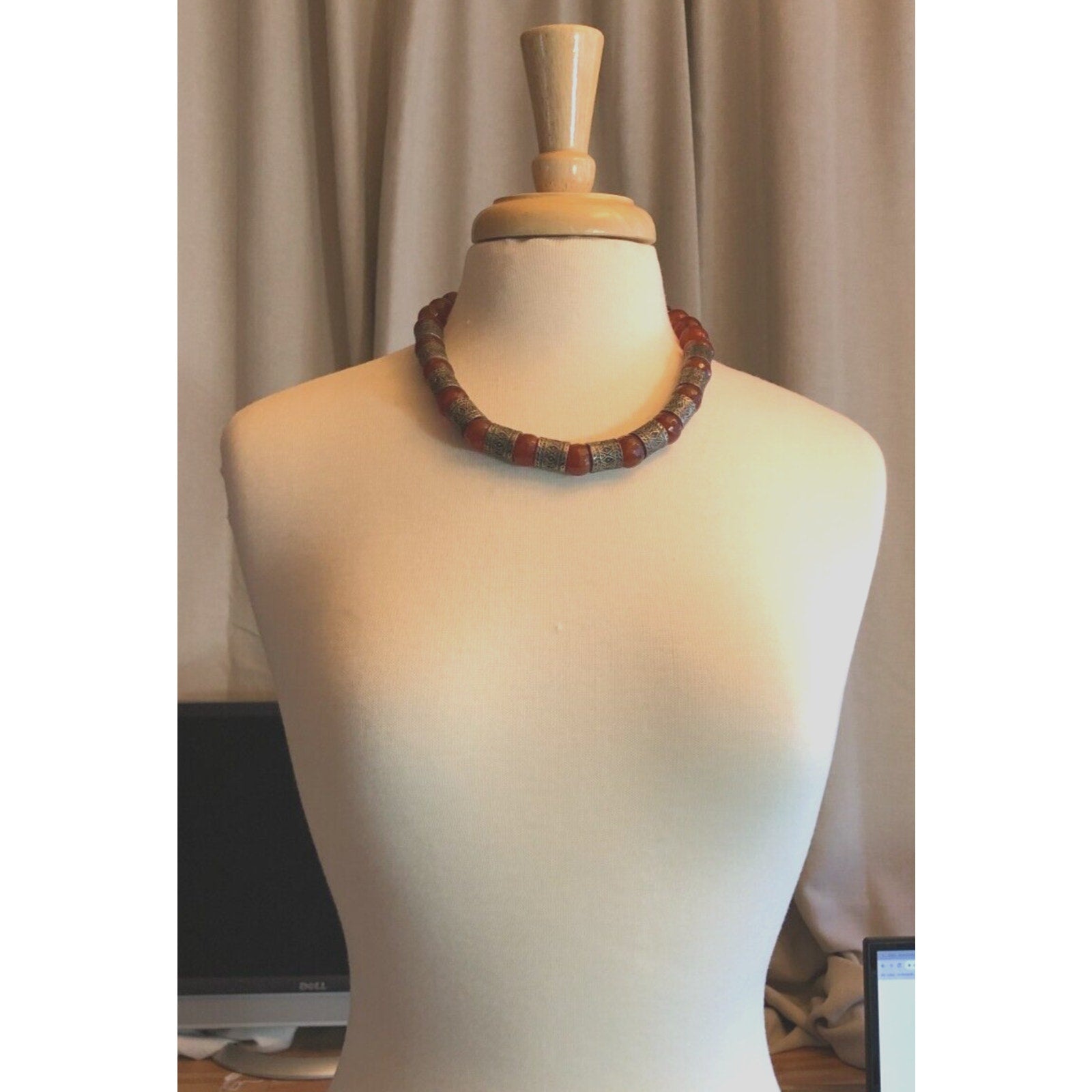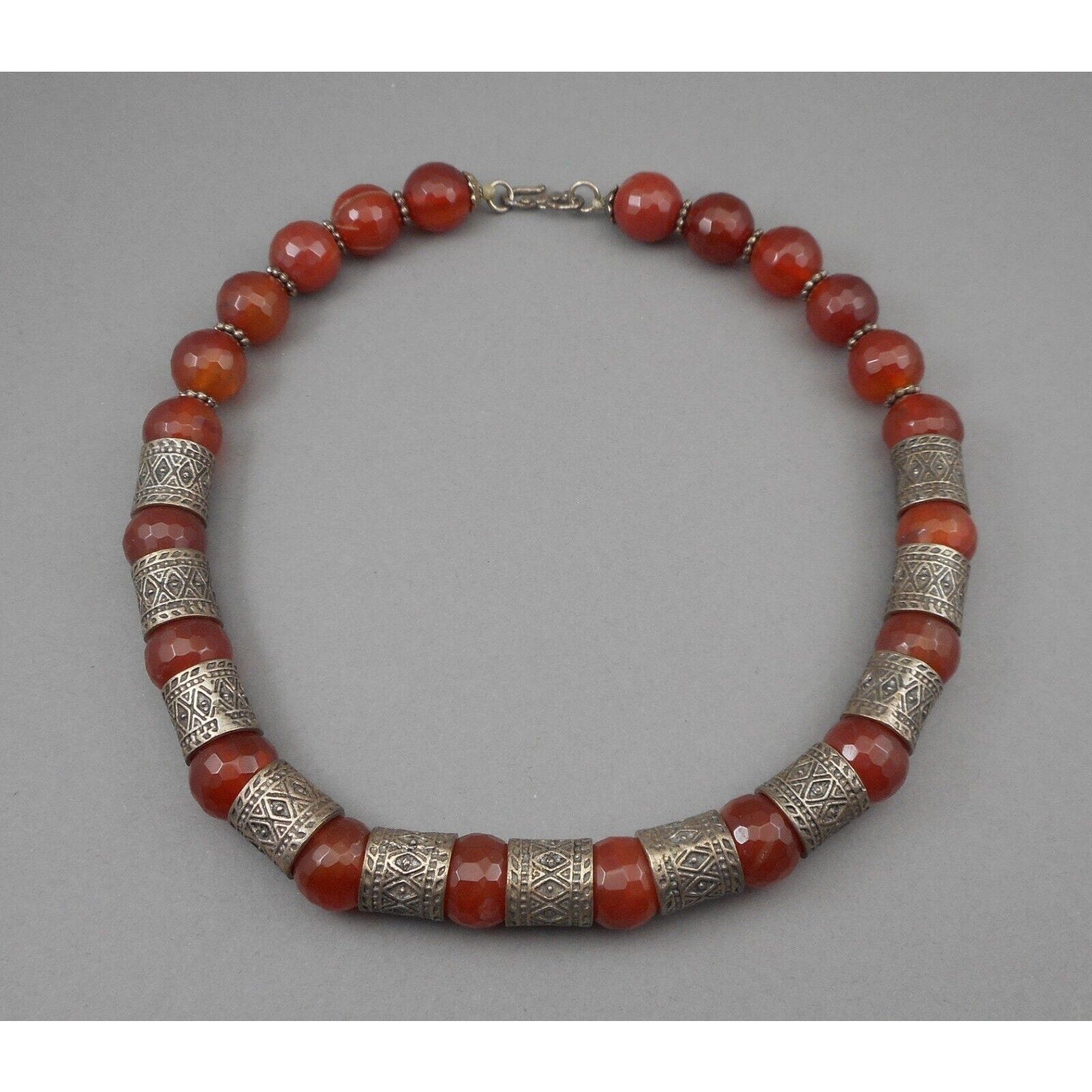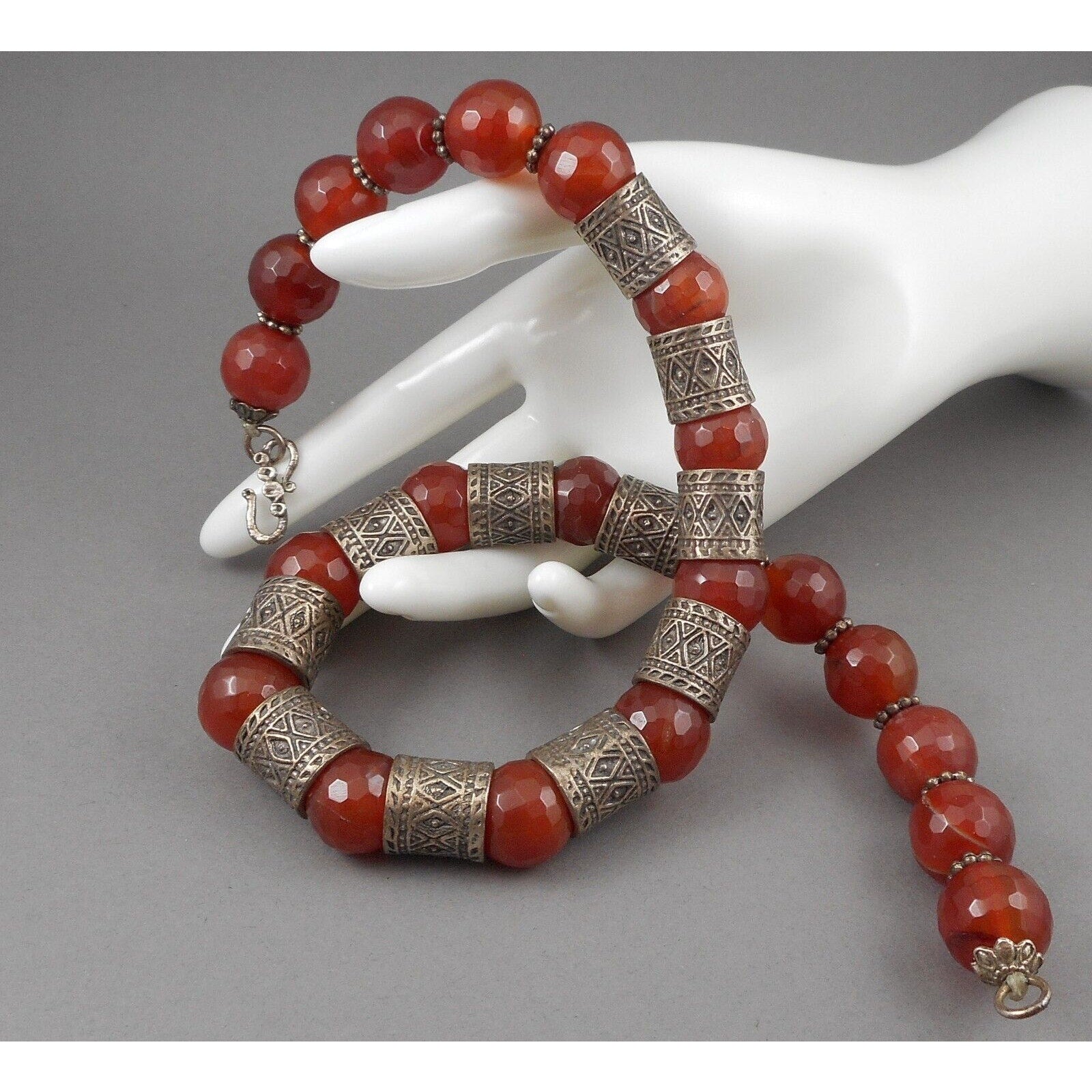 Vintage Handmade Syrian* Middle Eastern Necklace Red Quartz, possibly Carnelian Chalcedony Stone and Silver Metal Beads