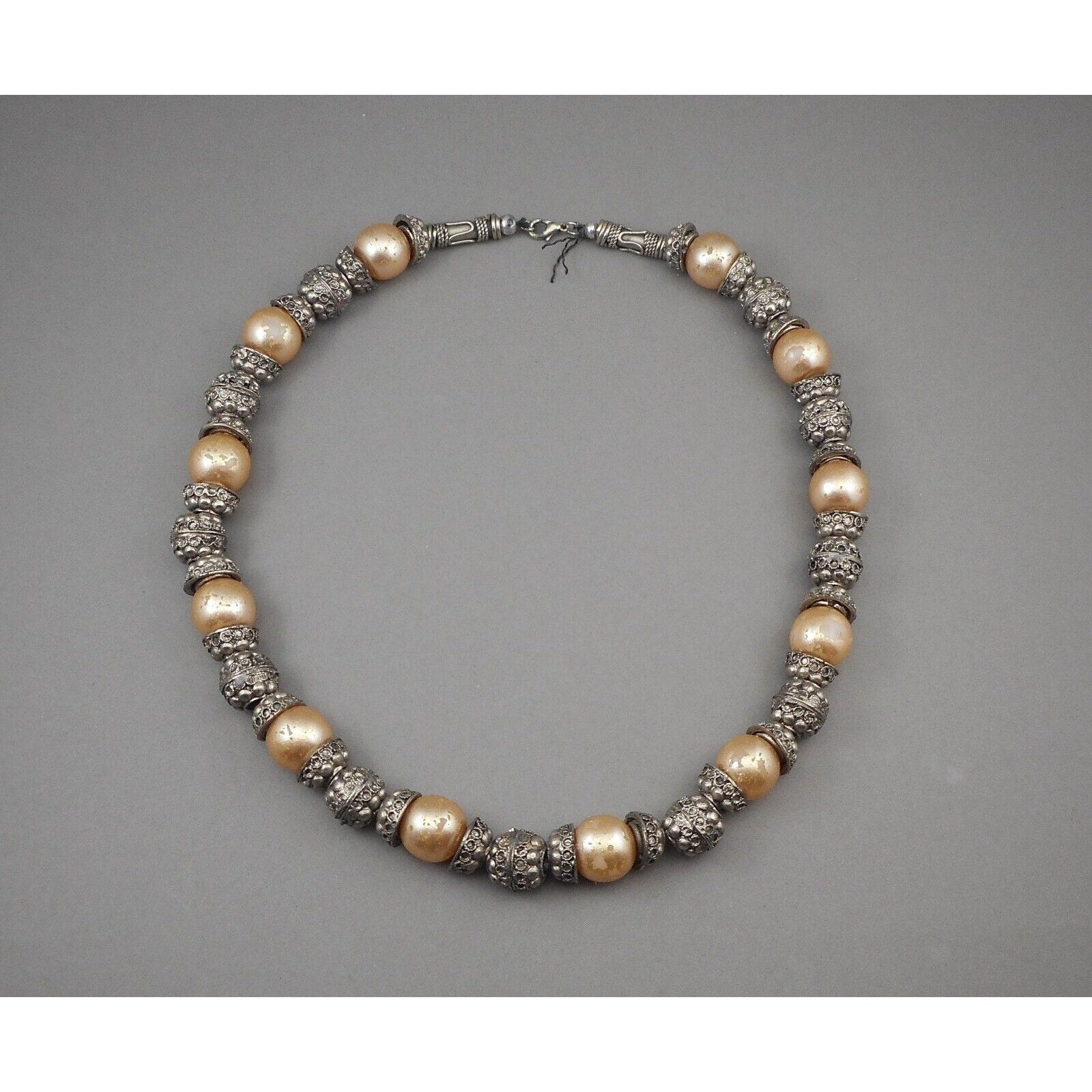 Vintage Handmade Syrian Middle East Necklace Silver Cannetille Faux Pearl Beads