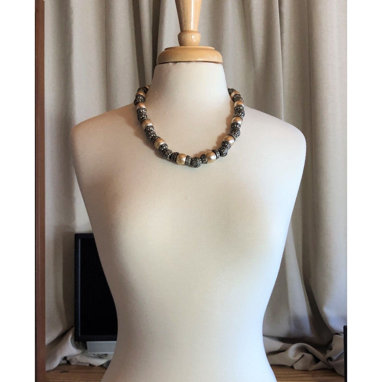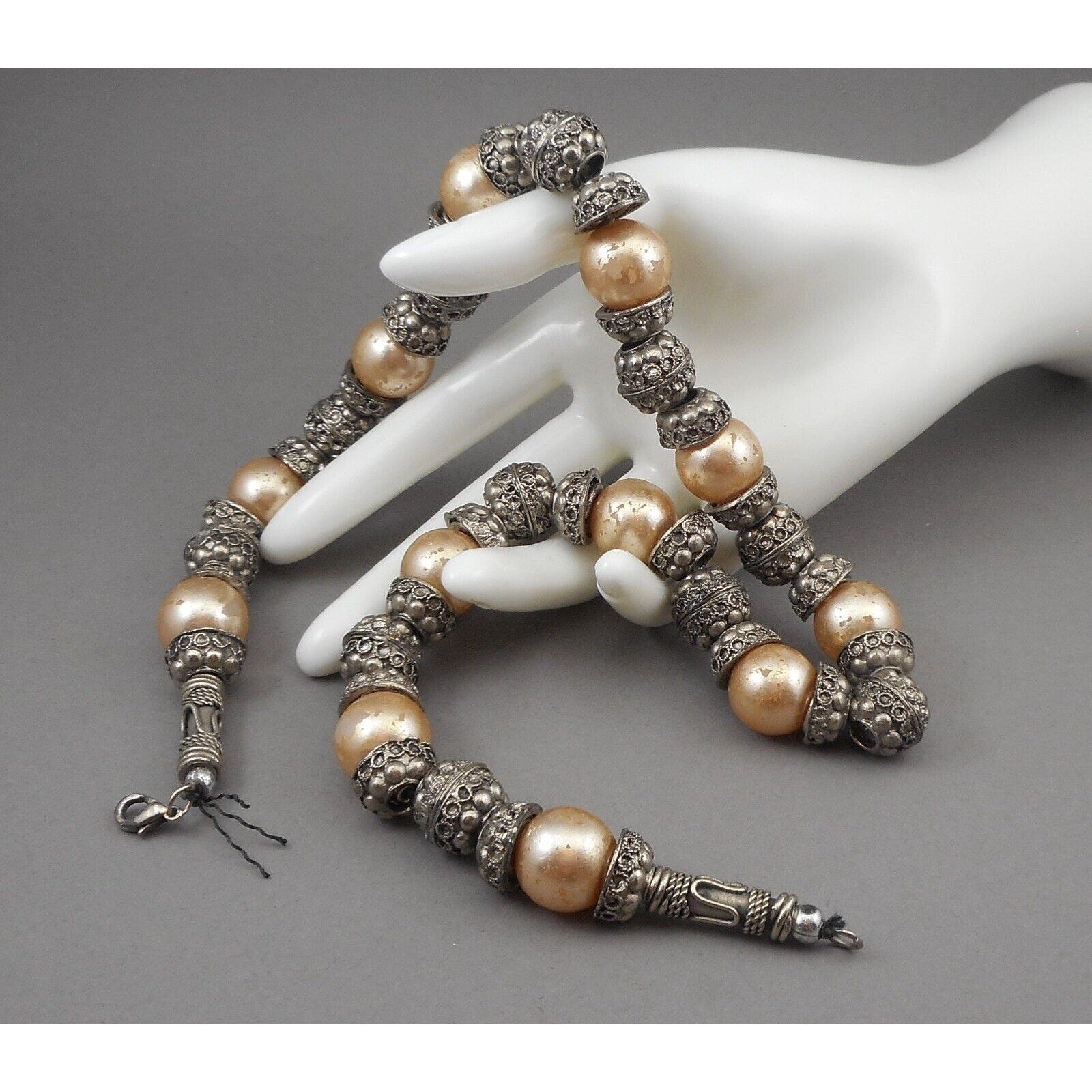Vintage Handmade Syrian* Middle Eastern Necklace Silver Tone Metal Cannetille Faux Pearl Beads