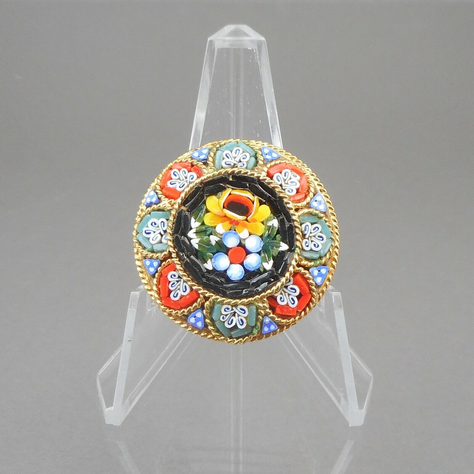 A vintage Italian glass micro mosaic and gold tone brooch. Very typical of a travel souvenir of Italy, but unmarked.