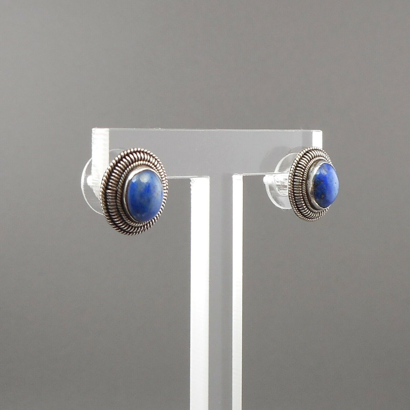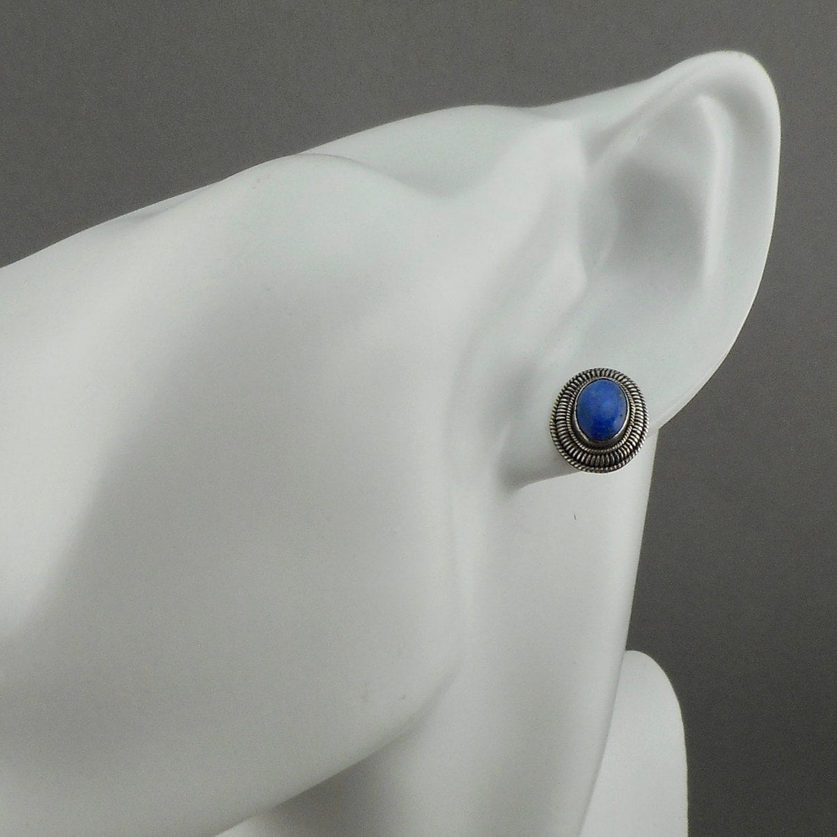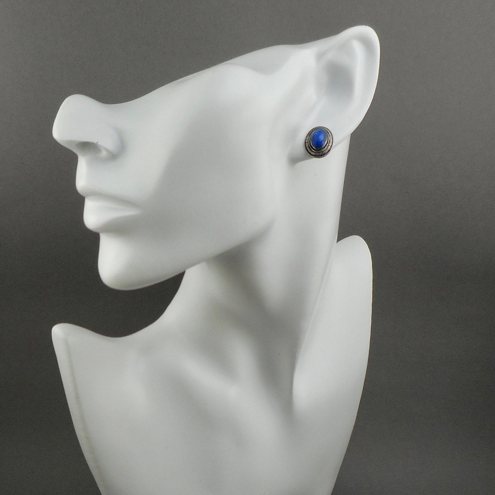 A pair of vintage lapis lazuli and sterling silver earrings. Southwestern USA, possibly Navajo, but unsigned. Oval lapis lazuli cabochons in bezel settings with solid backs. Each stamped 925, the included backings are replacements.