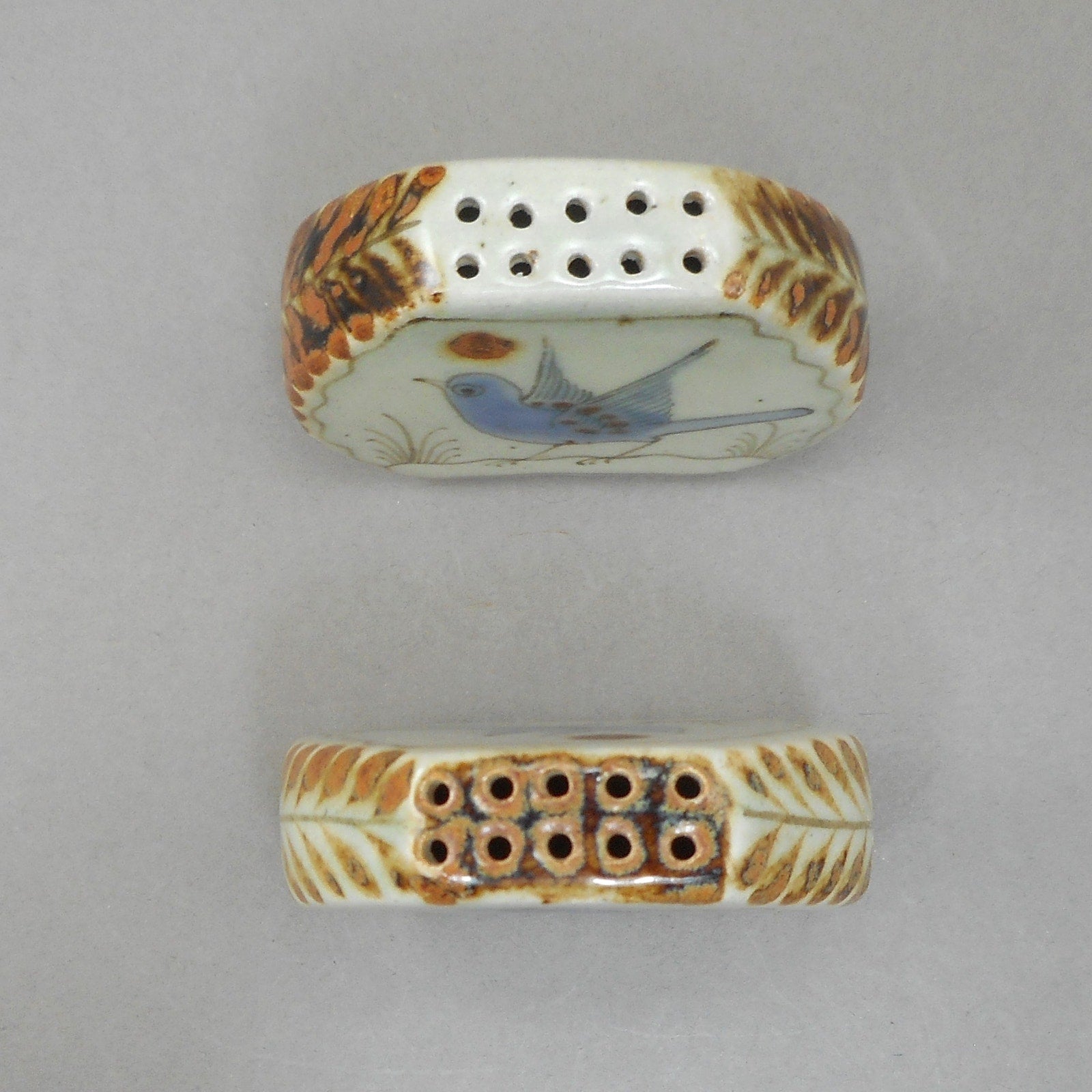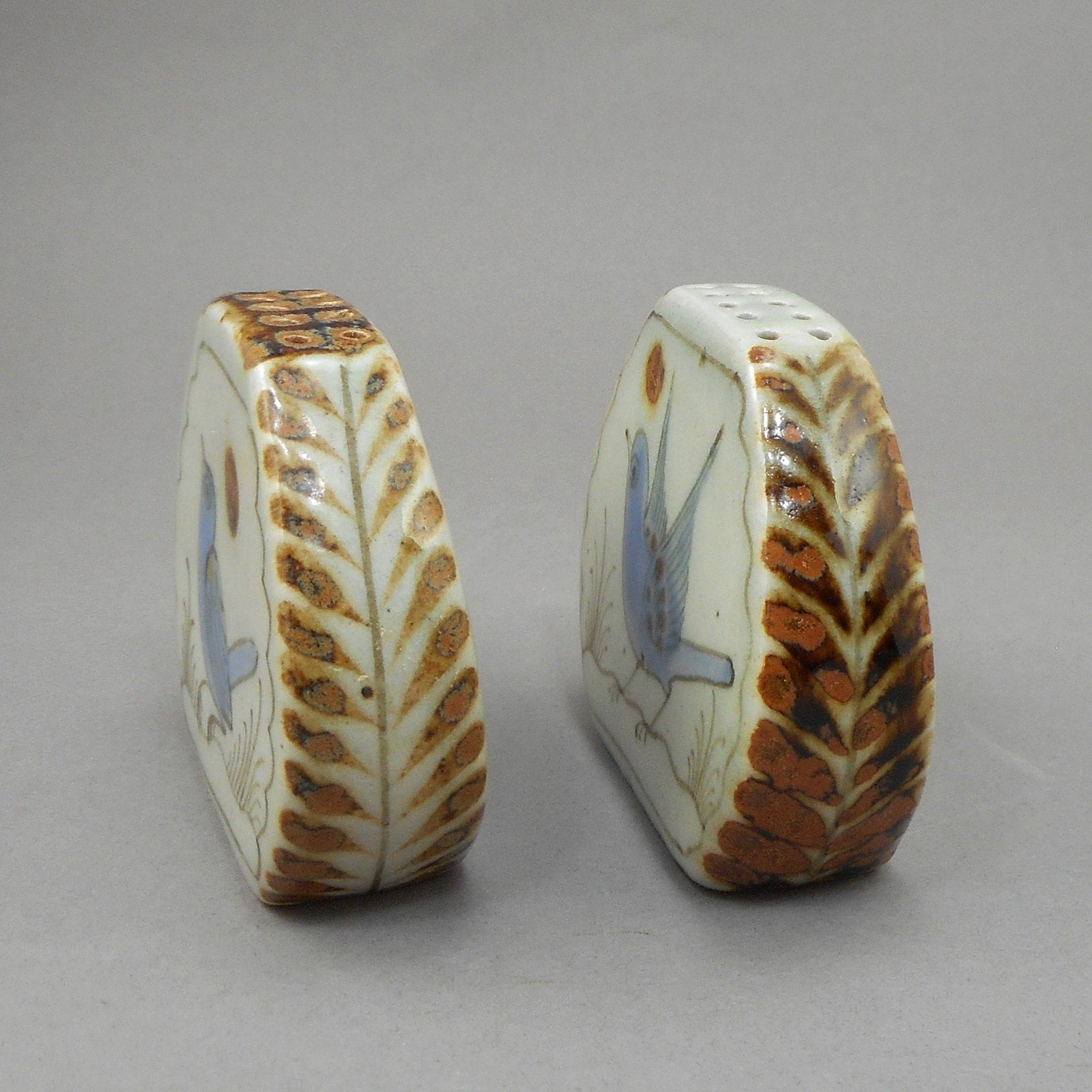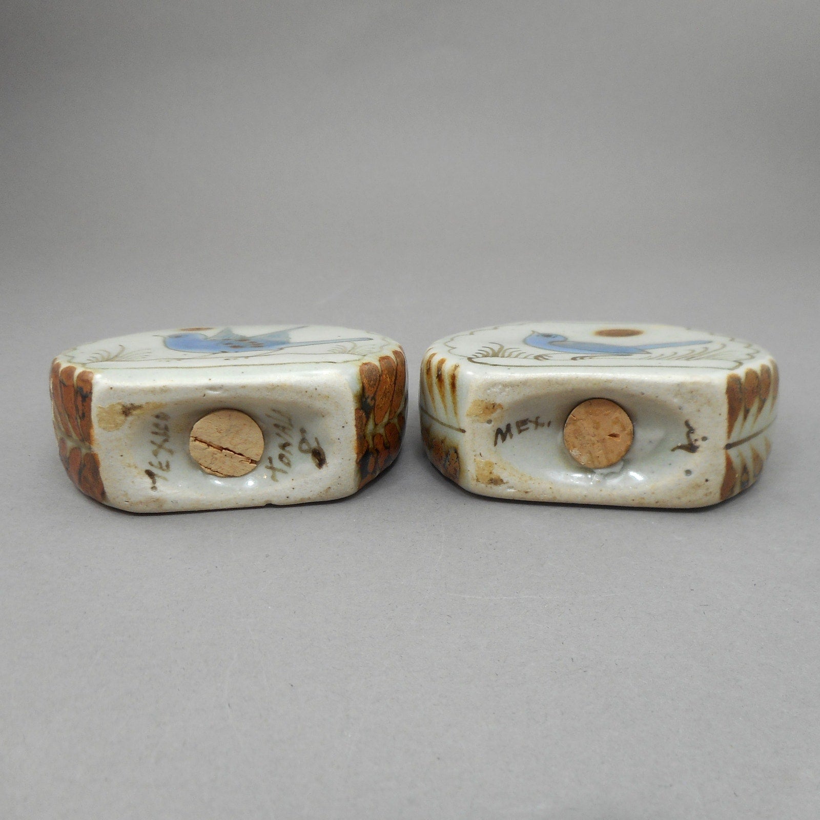 Excellent vintage condition with cork stoppers intact, free of damage. Color and glaze variations are characteristic of handmade studio pottery.