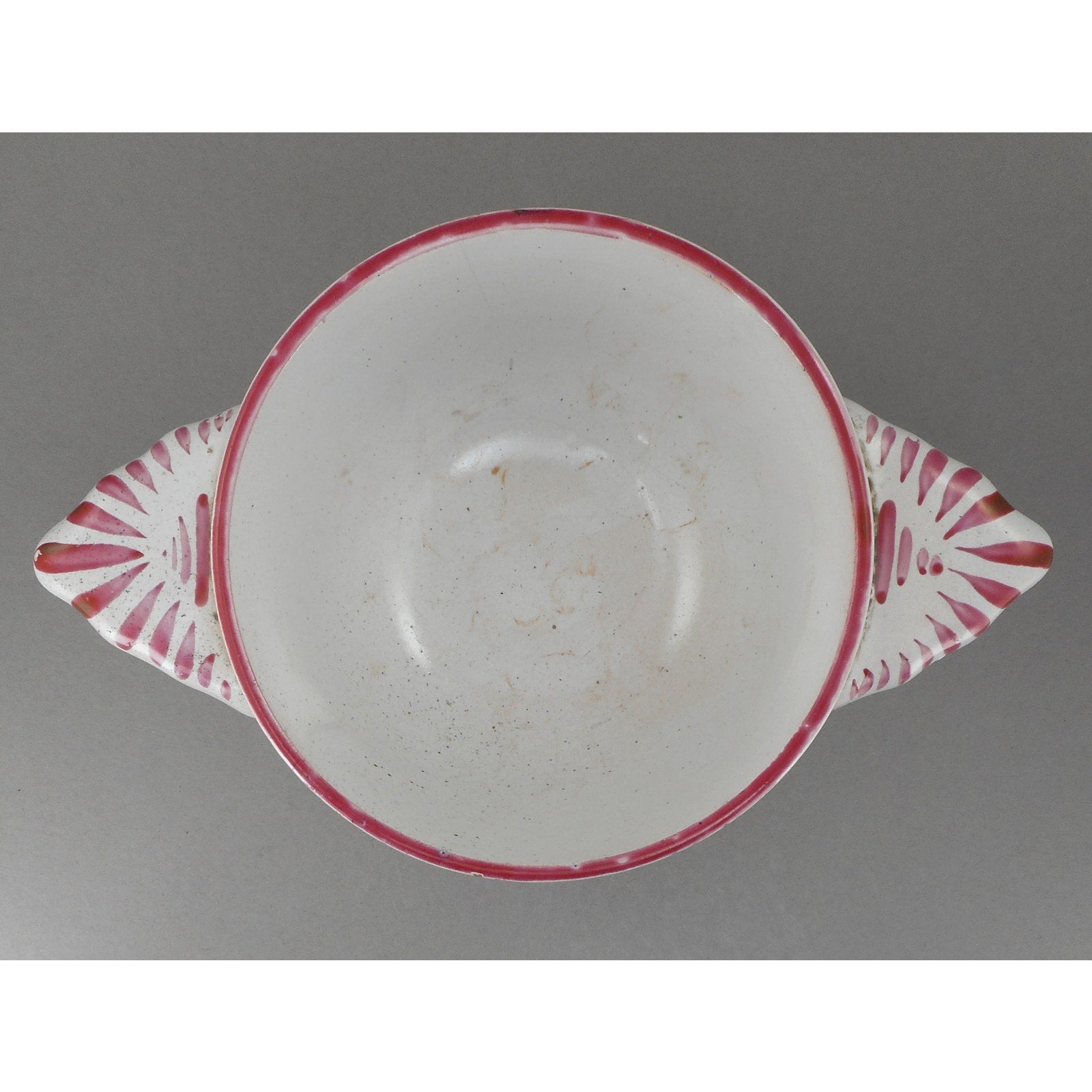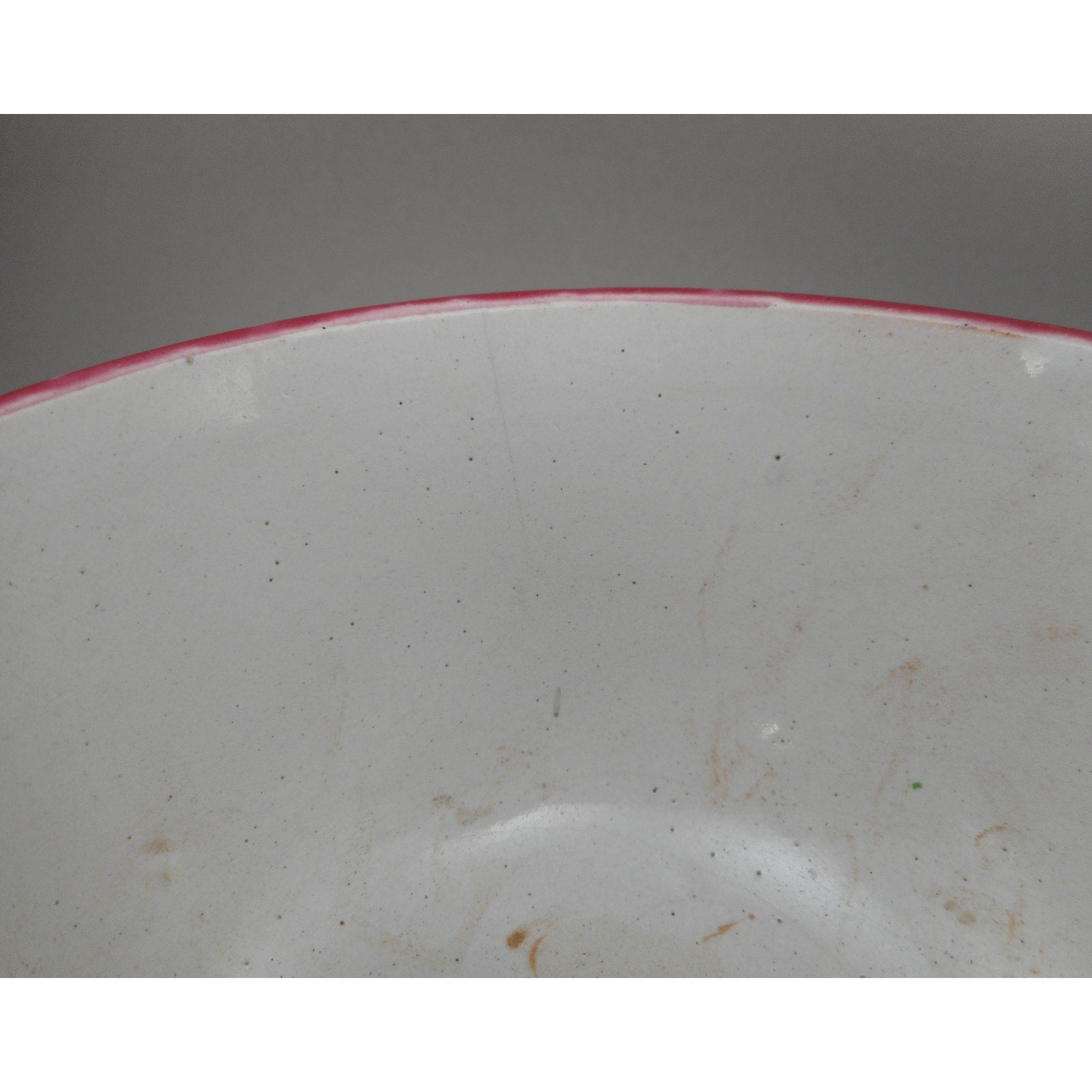 Antique / vintage used condition with expected wear commensurate with age and use and documented in our photographs. This includes small nicks to the glaze and a faint and shallow hairline inside the bowl. It does not travel through the pottery to the outside.