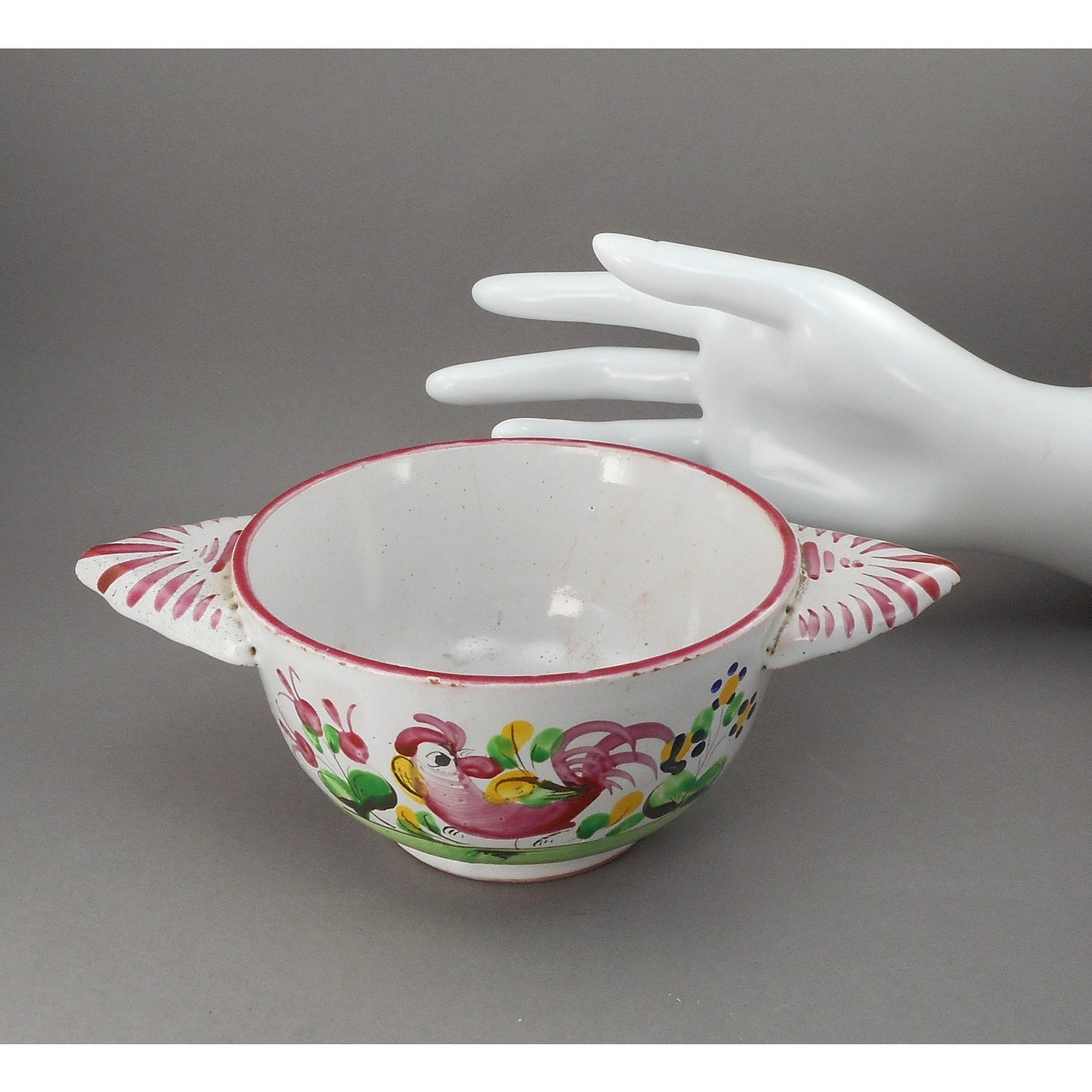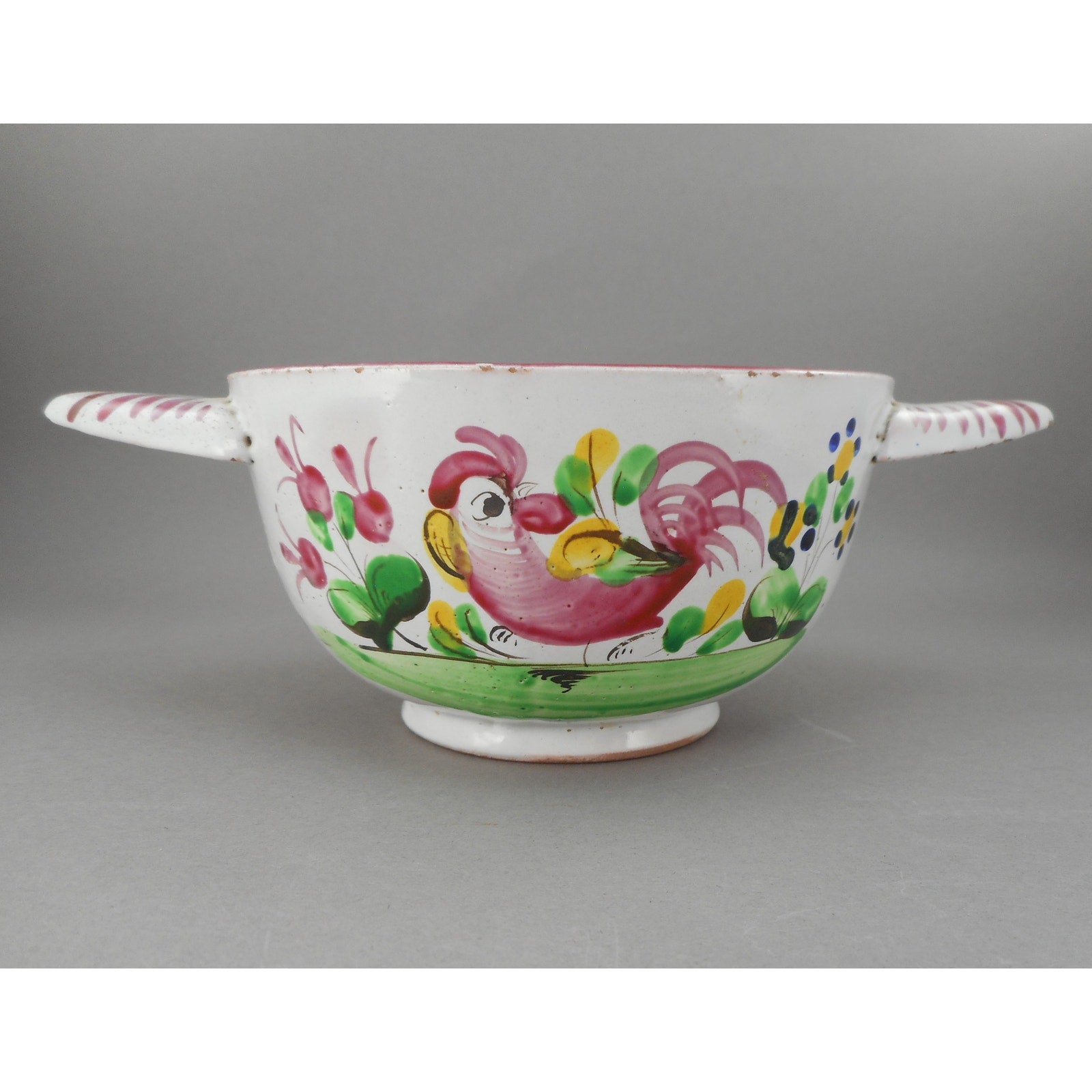 Antique French Faience Pottery Porringer Bowl with Lug Handles - Handpainted Rooster Chanticleer and Flowers - marked France - White Red Pink