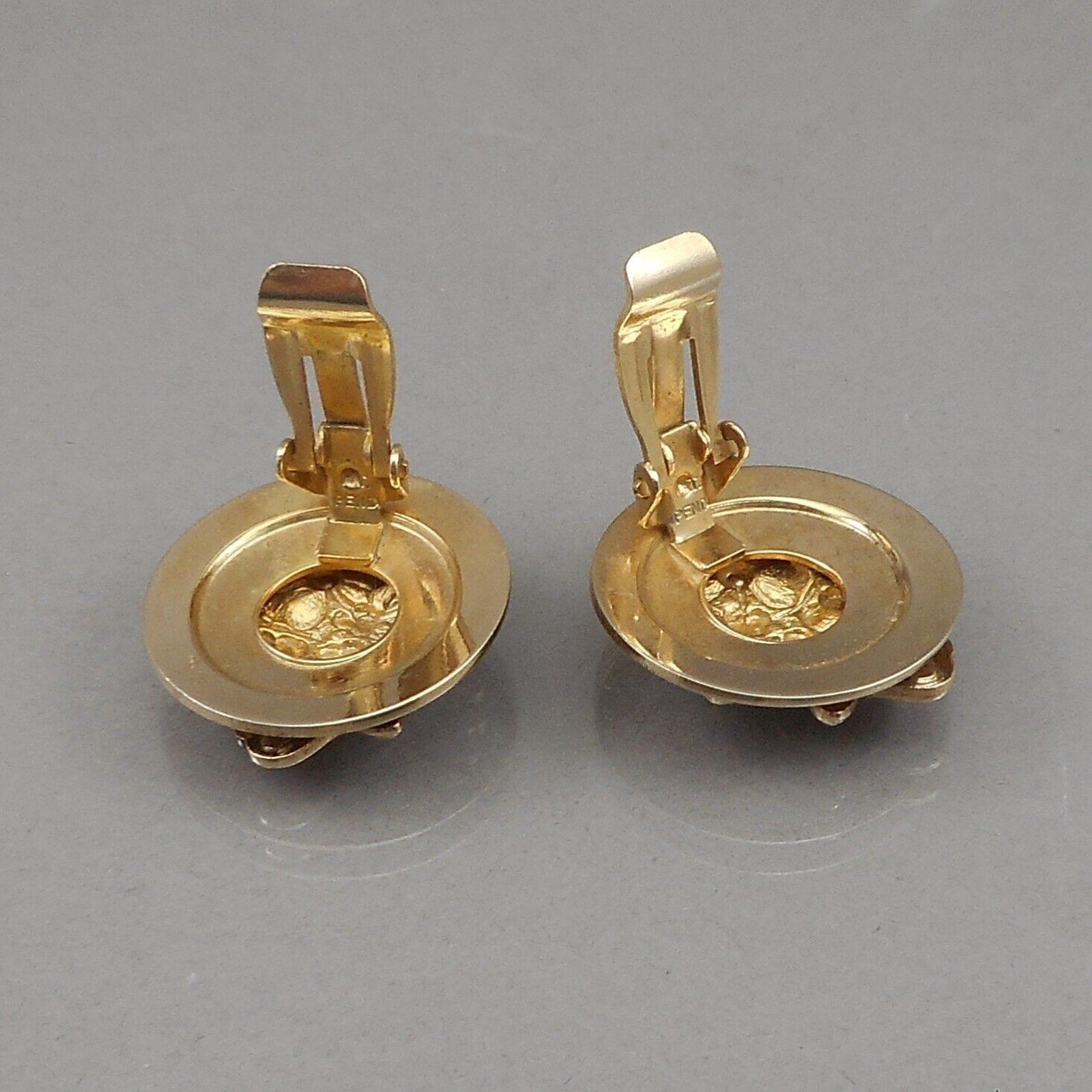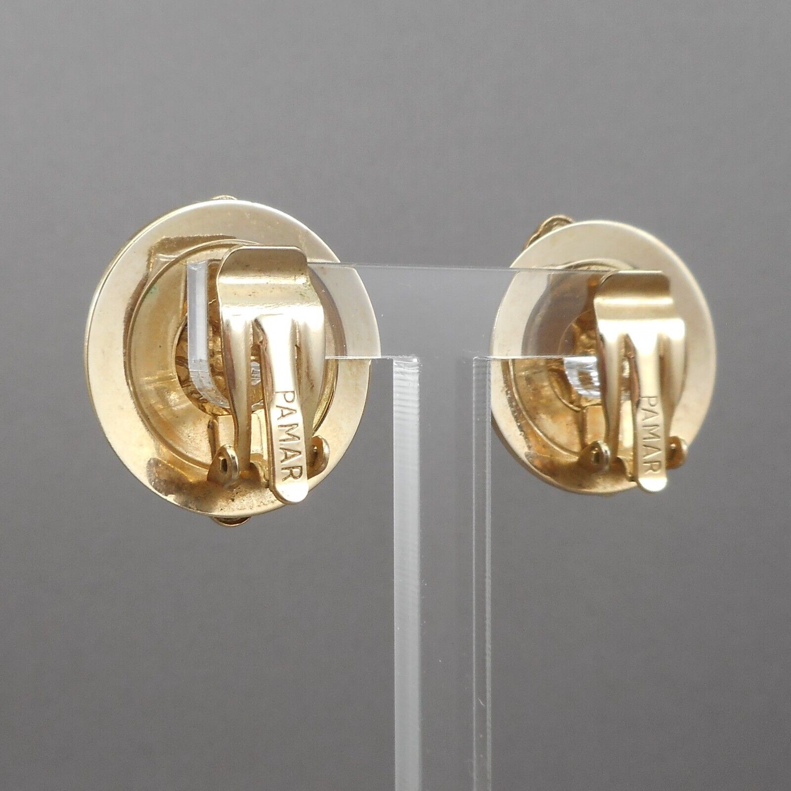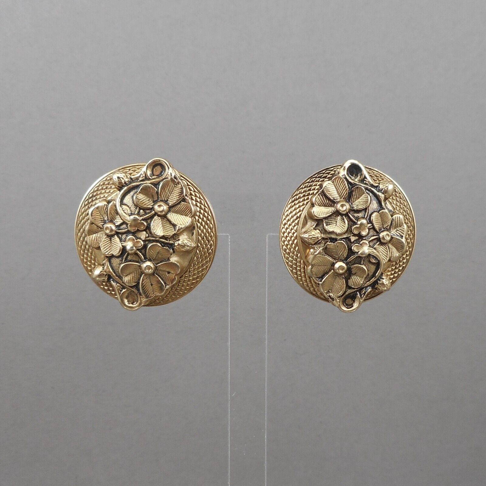 A facing pair of vintage button style earrings, circa 1950. Gold tone with clip backings for non pierced ears.