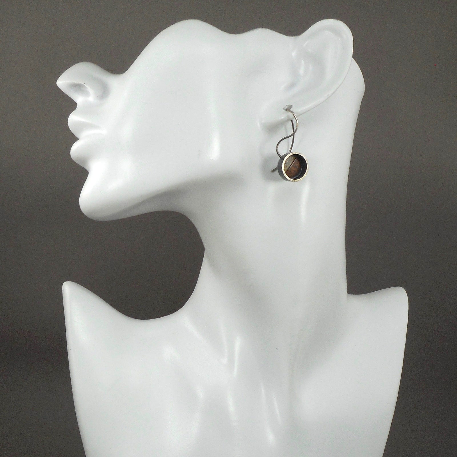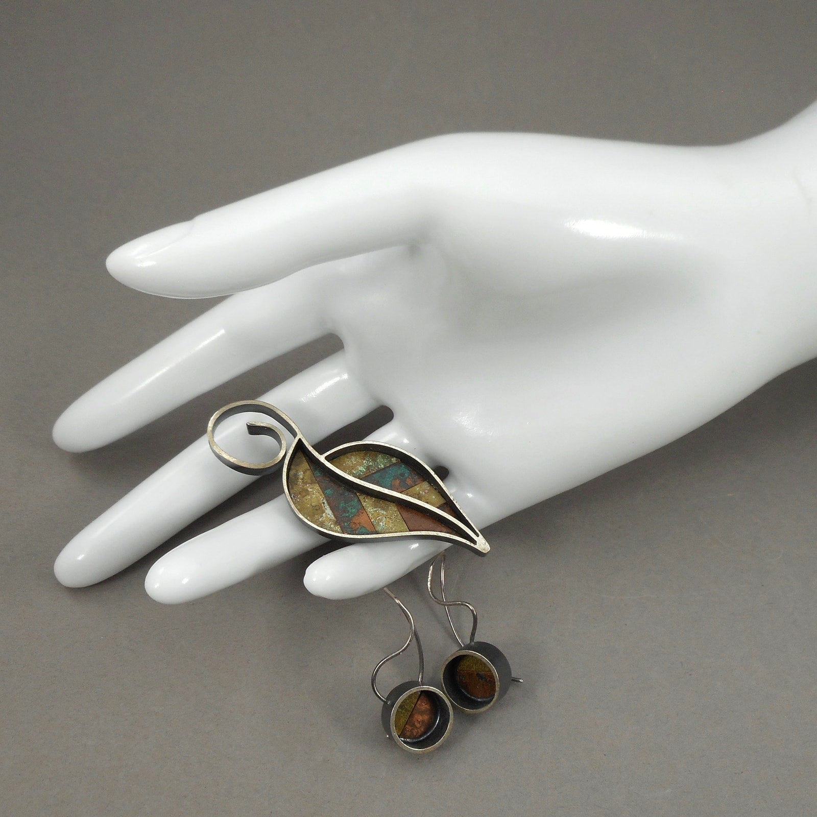 Vintage Kinzig Design Handmade Mosaic Leaf Brooch Pin and Earrings Set - Sterling Silver, Brass and Copper -  USA Artisan Hand Crafted