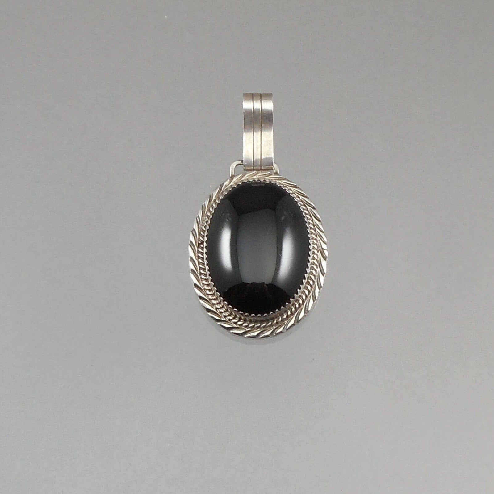 A vintage natural onyx and sterling silver pendant attributed Navajo jewelry artist Johnson Yazzie. (Signed Y) Black onyx in a bezel setting with a solid backing.