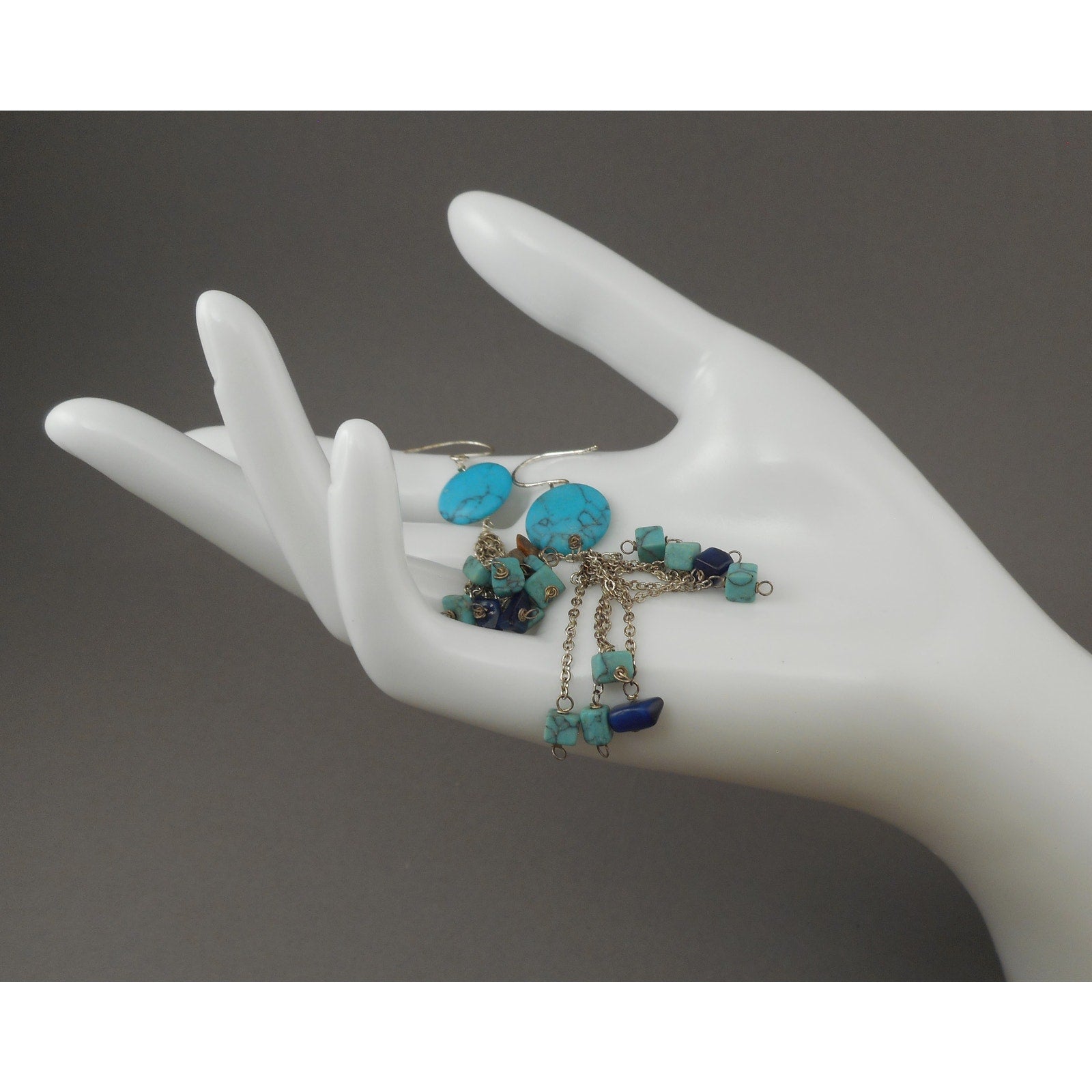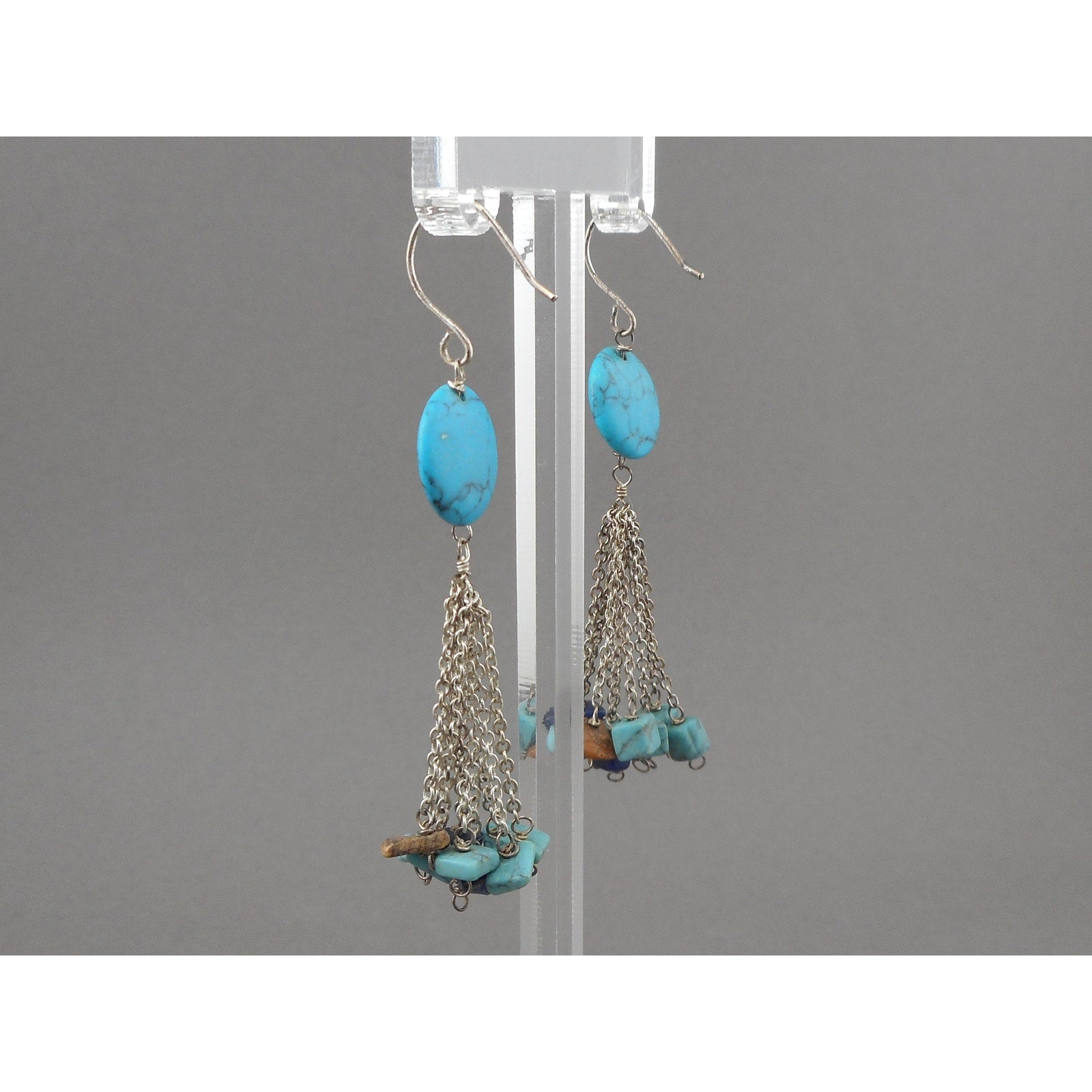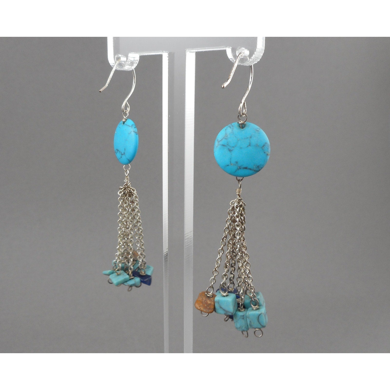 Vintage Stone Nugget Bead Dangle Earrings - Southwestern Style, Silver Tone, Turquoise, Sodalite, Jasper