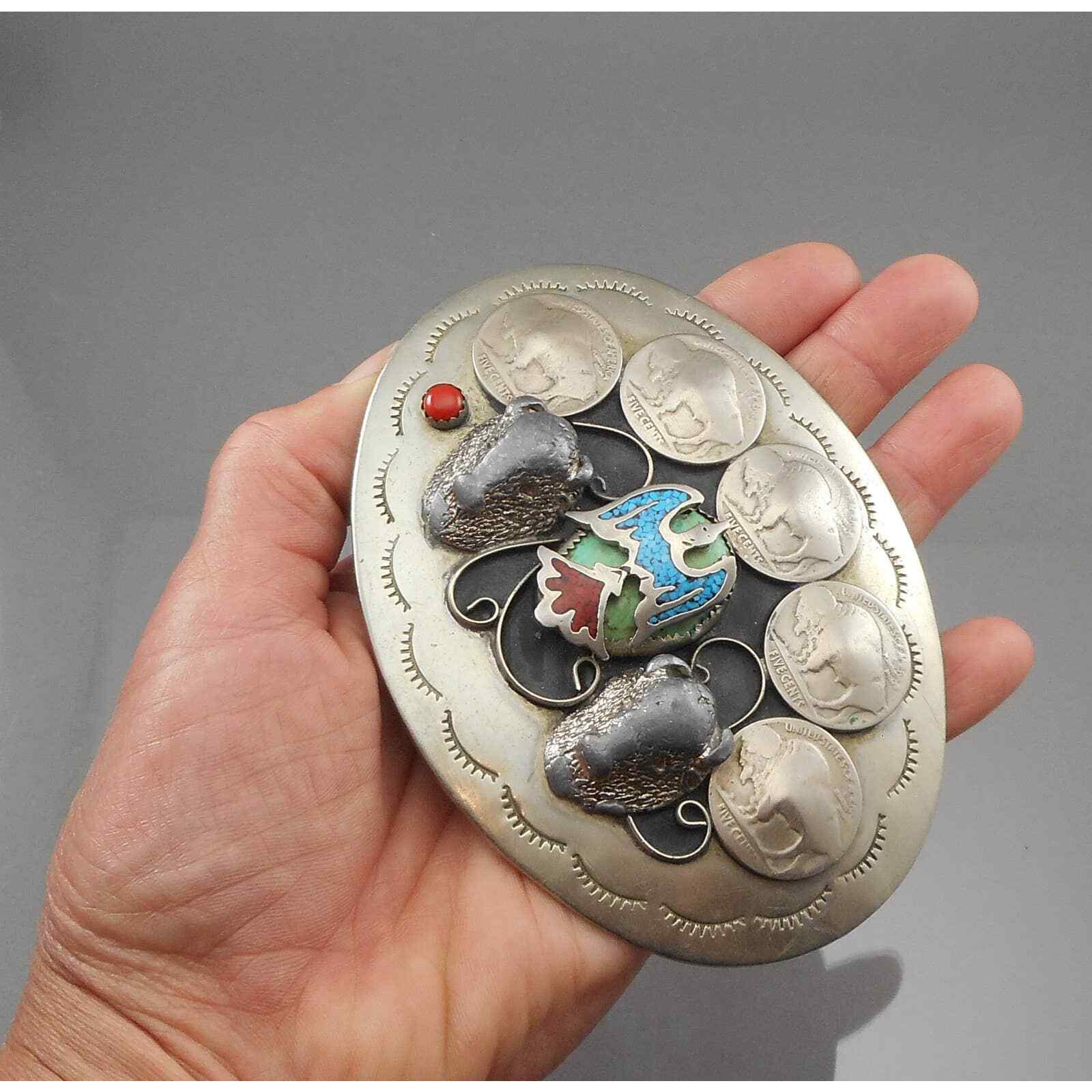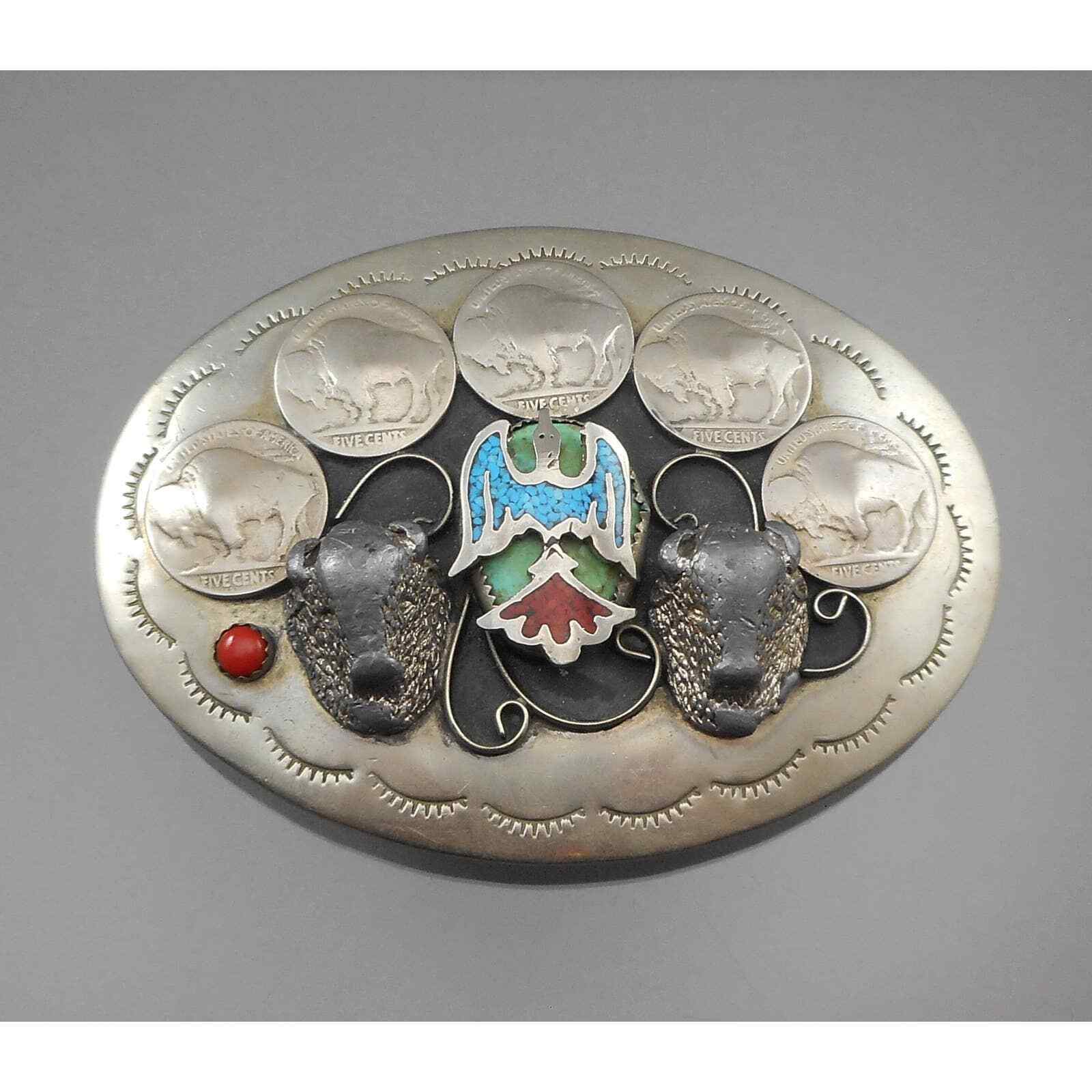 Large Handmade Vintage Navajo Native American * Belt Buckle - Silver Buffalo Nickels, Turquoise, Coral - Eagle and Buffalo Head Designs - Southwestern Artisan Jewelry